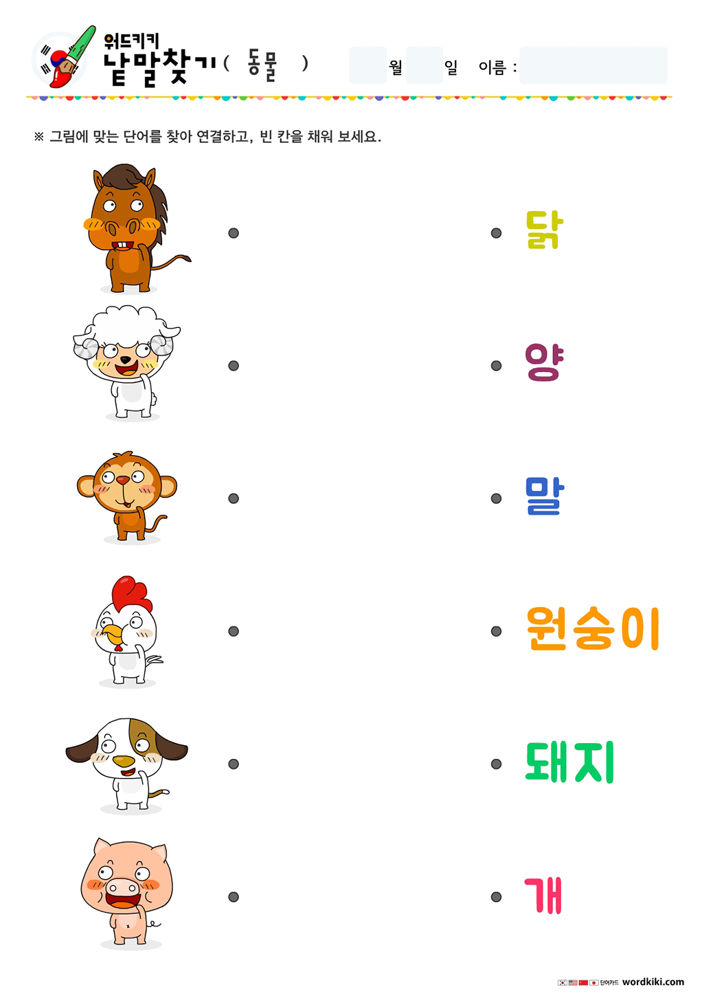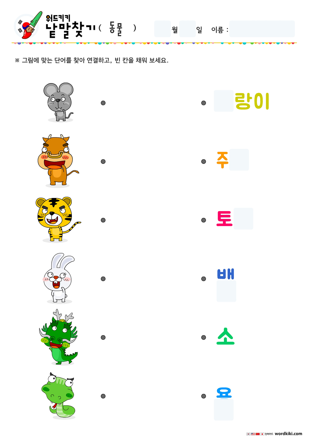 동물 낱말 쓰고, 그림 연결하기
