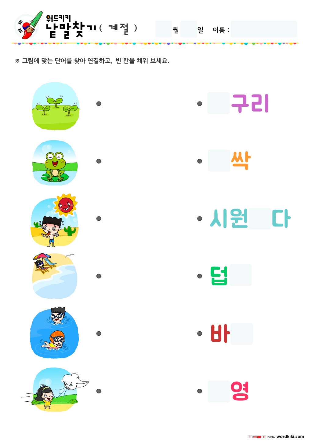 사계절,따뜻하다(따뜻한),새싹,개구리,덥다(더운),바다,수영,시원하다(시원한),잠자리,낙엽,춥다(추운),눈사람,눈