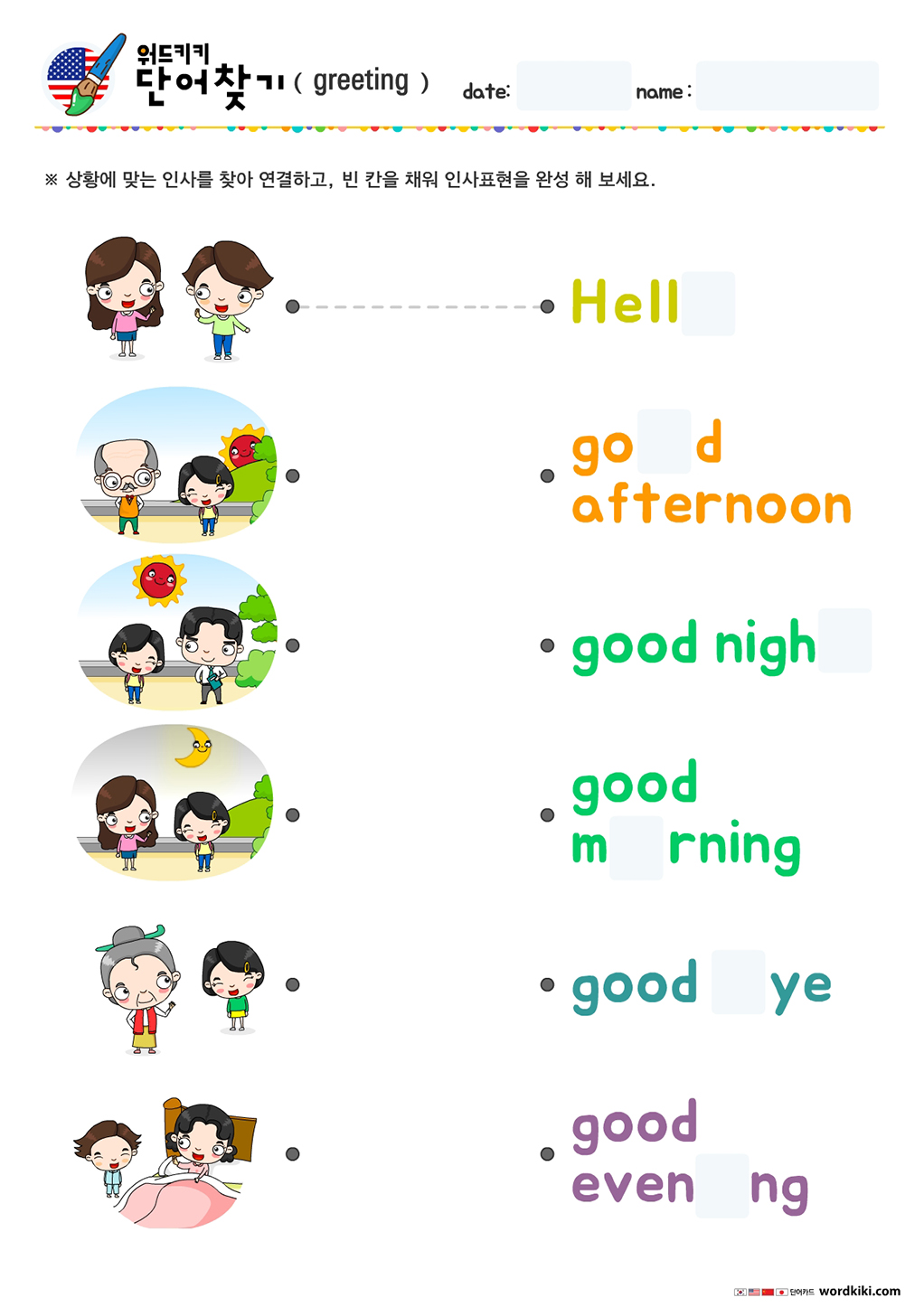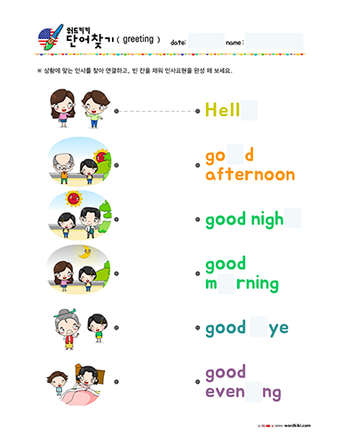 영어인사단어-낱말 연결하기/빈 칸 채우기