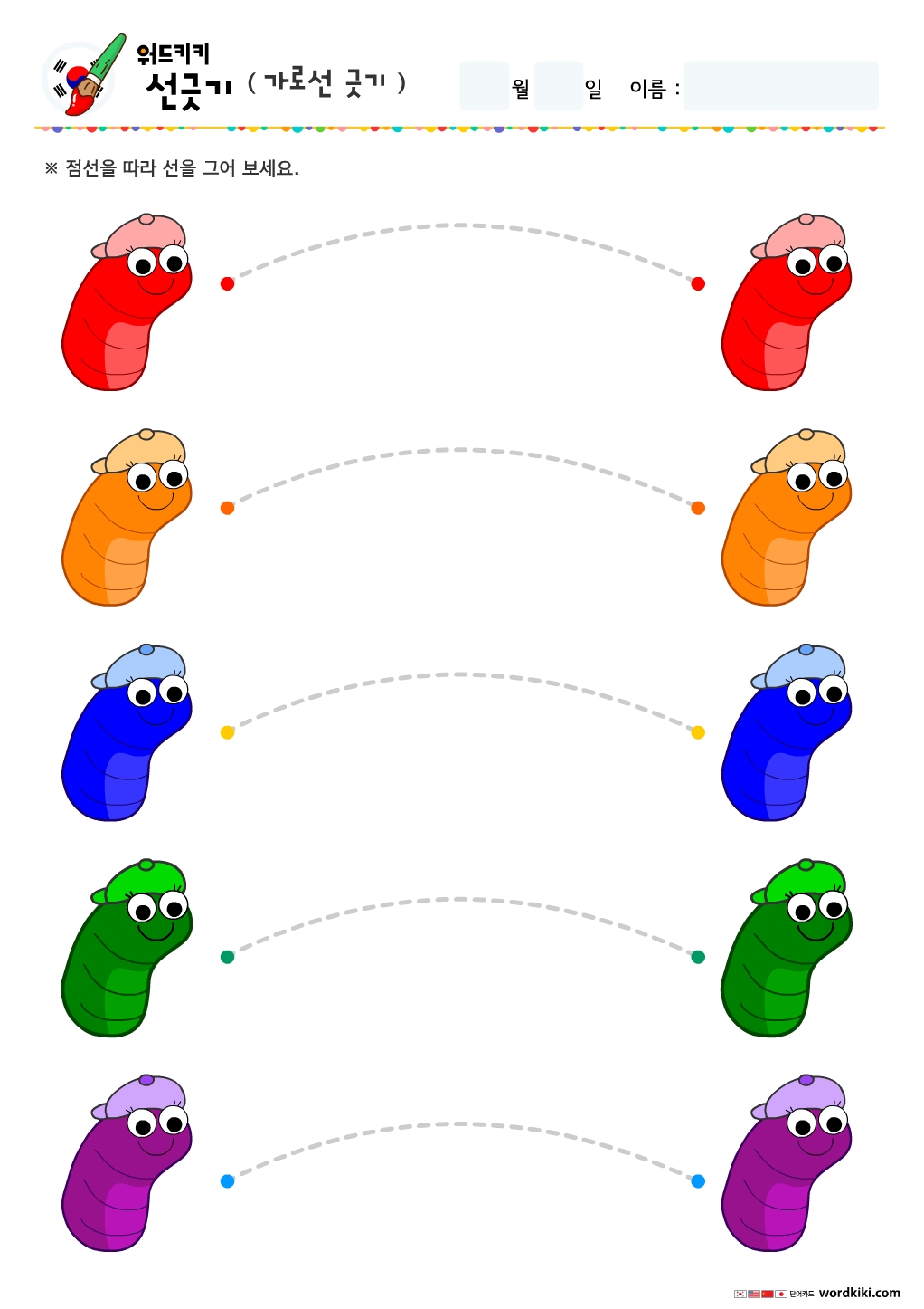 아이들과 함께크레파스나, 색연필등을 이용해 점선을 따라 선을 그리며 사물의 명칭도 같이 학습 할 수 있습니다.