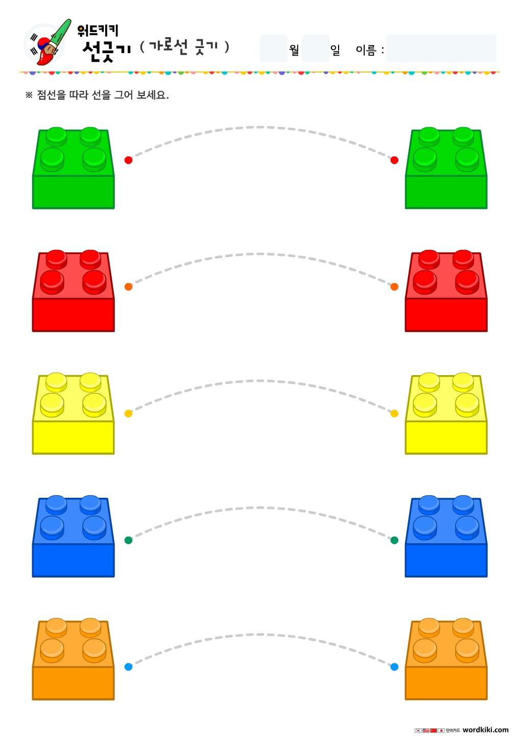 아이들과 함께크레파스나, 색연필등을 이용해 점선을 따라 선을 그리며 사물의 명칭도 같이 학습 할 수 있습니다.