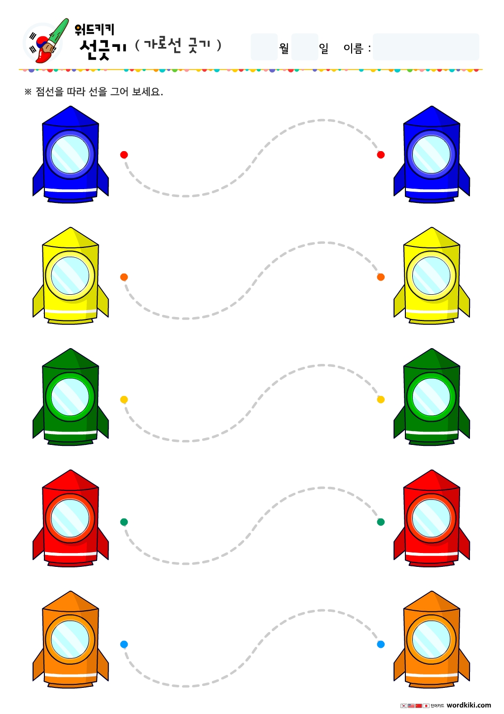 곡선을 따라 그리는 프린트 학습지로 로케트, 개구리, 안경, 나라 등다양한 테마로 작성되었으며
