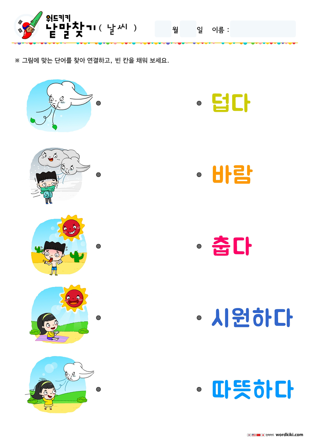날씨,맑다,흐리다,비,눈,바람,춥다,덥다,따뜻하다,시원하다