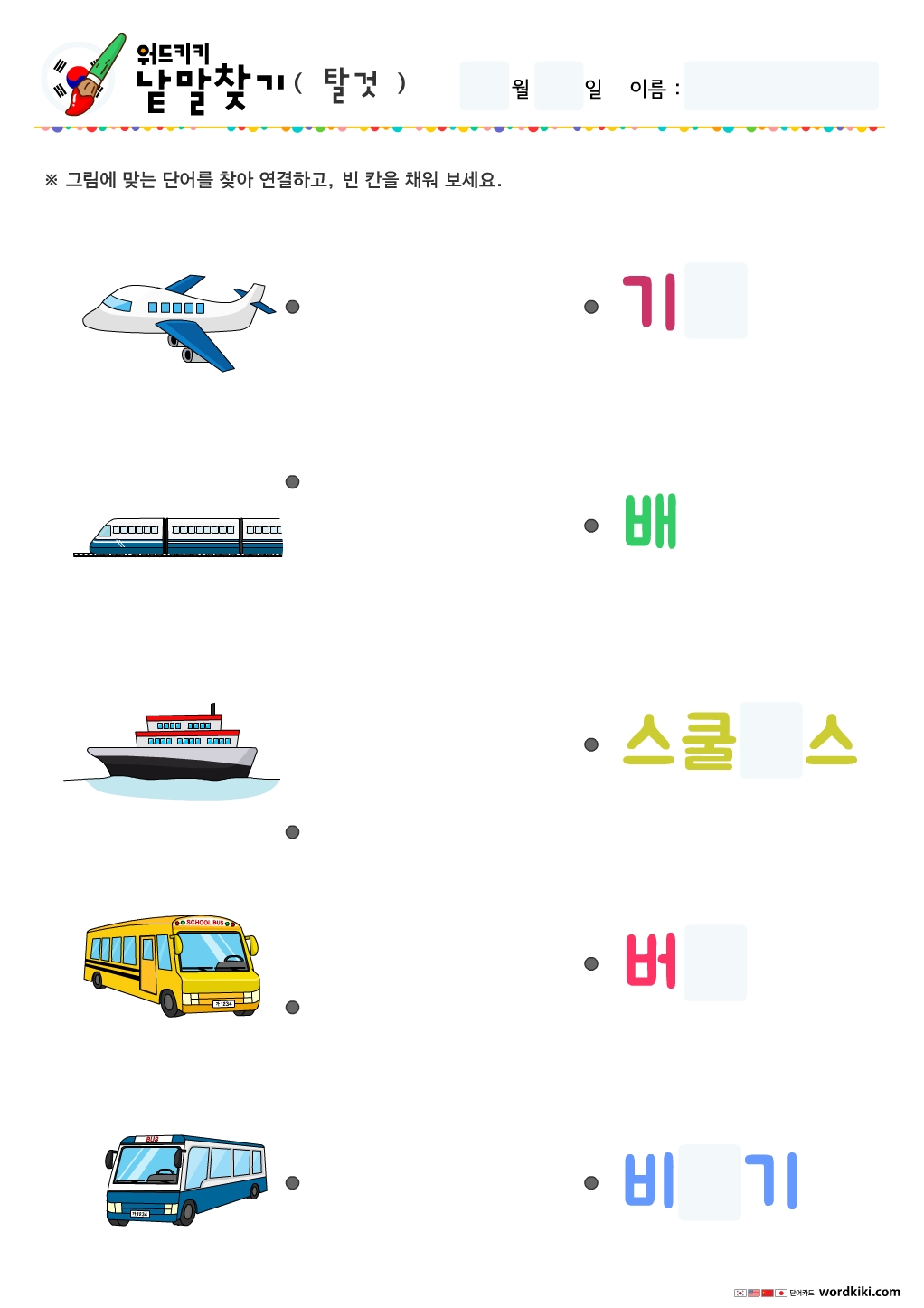 [한글 활동지 4장] 16 탈것 단어연결하기