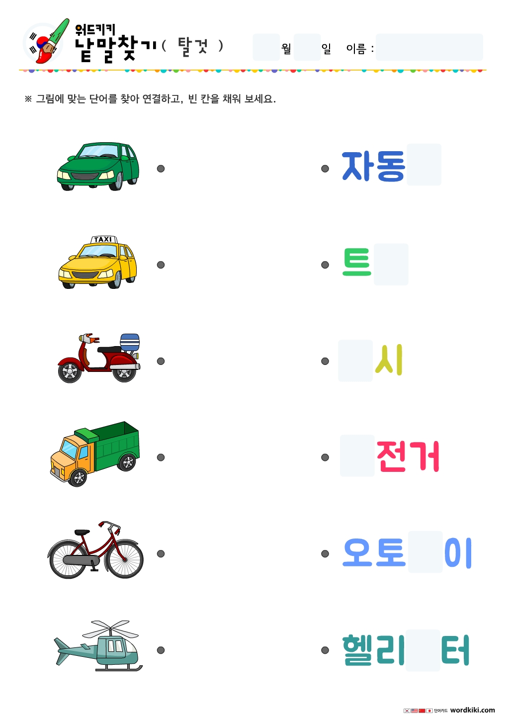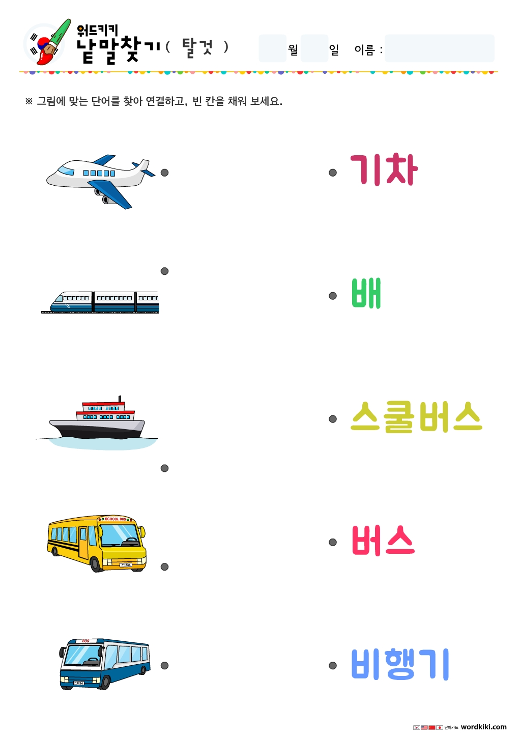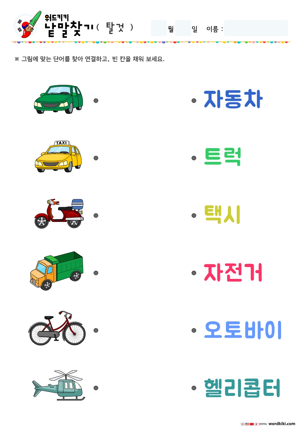탈것(교통수단) 그림을 보고 맞는 단어를 찾아 선으로 연결해 주세요!!