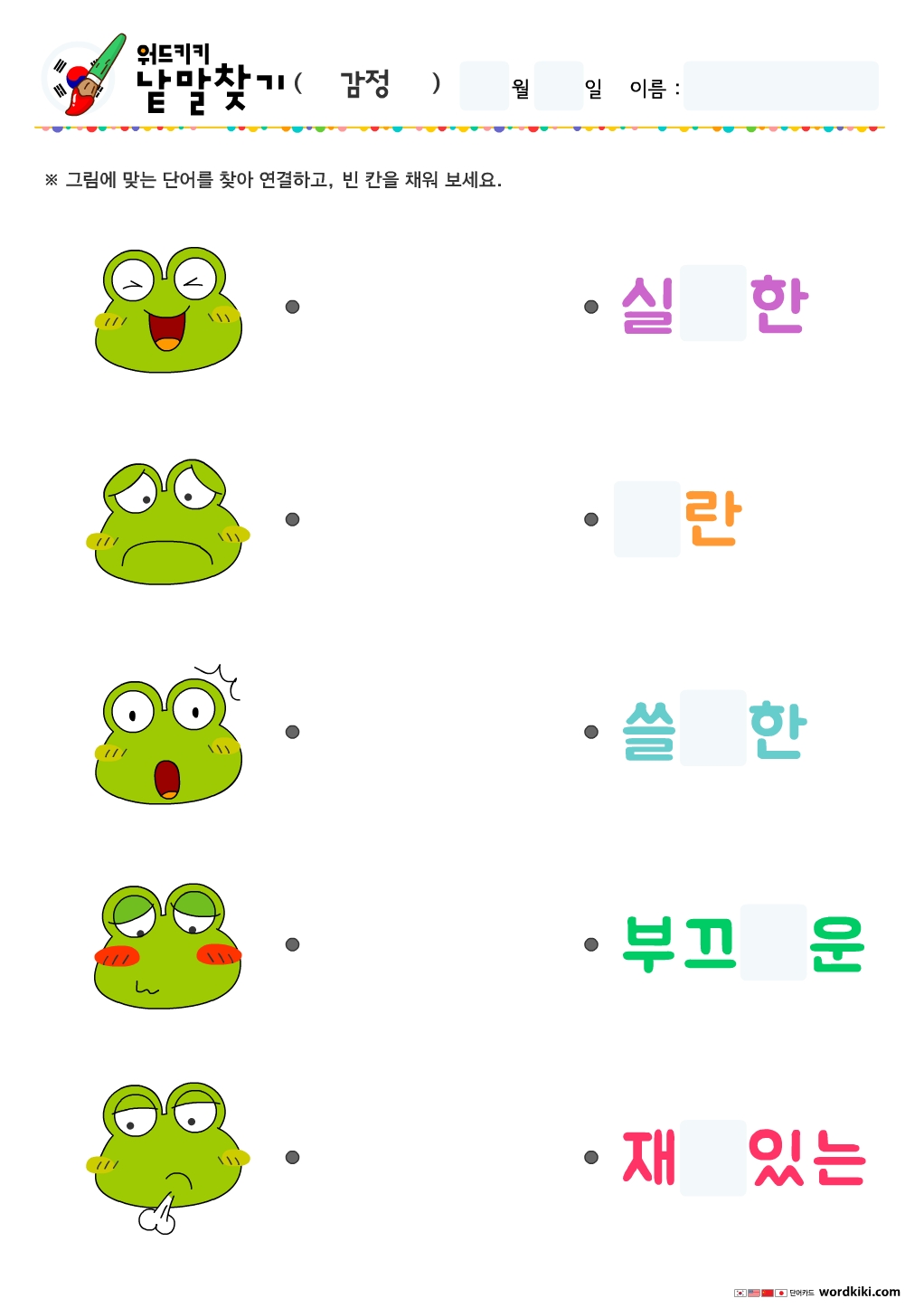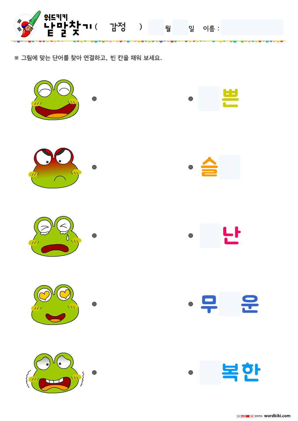 기쁜,화난,슬픈,행복한,무서운,재미있는,쓸쓸한,놀란,부끄러운,실망한