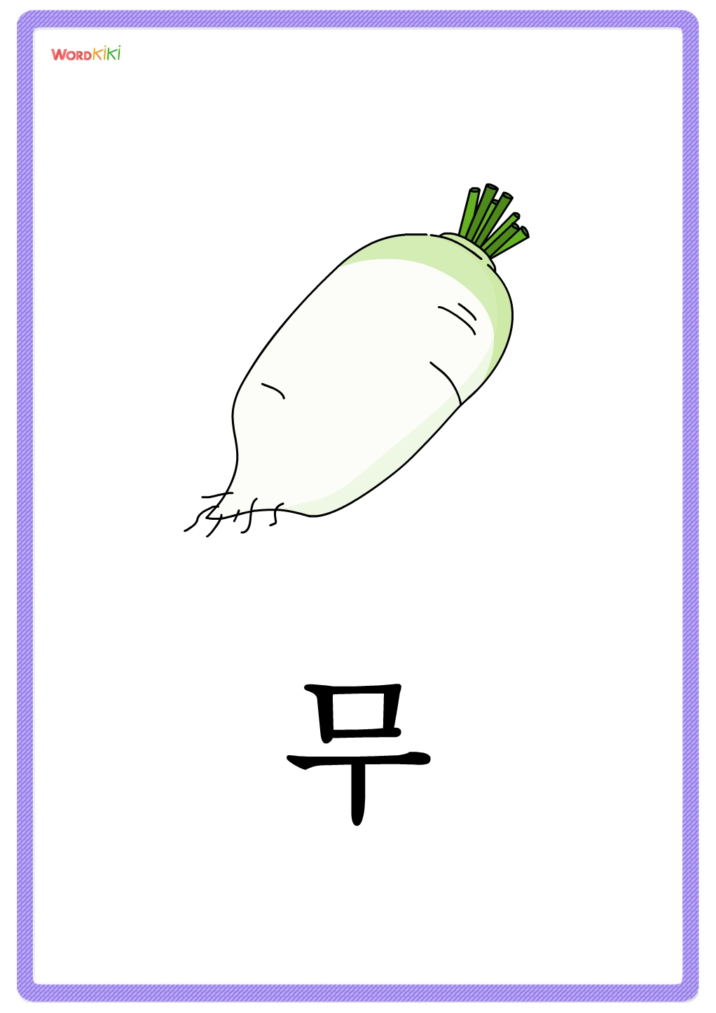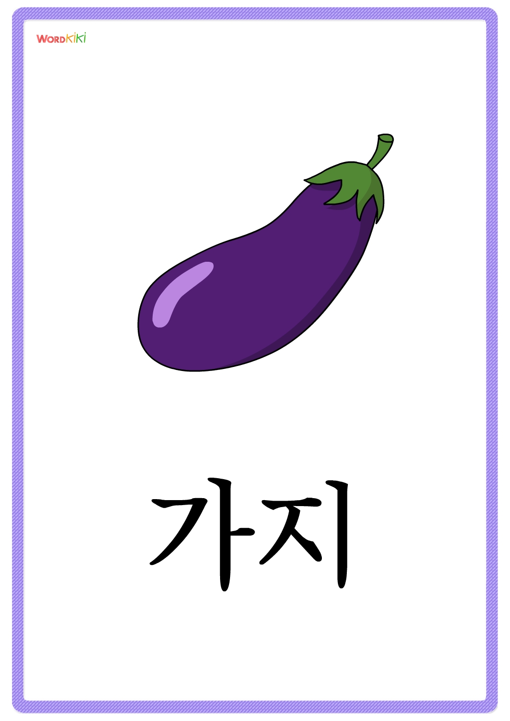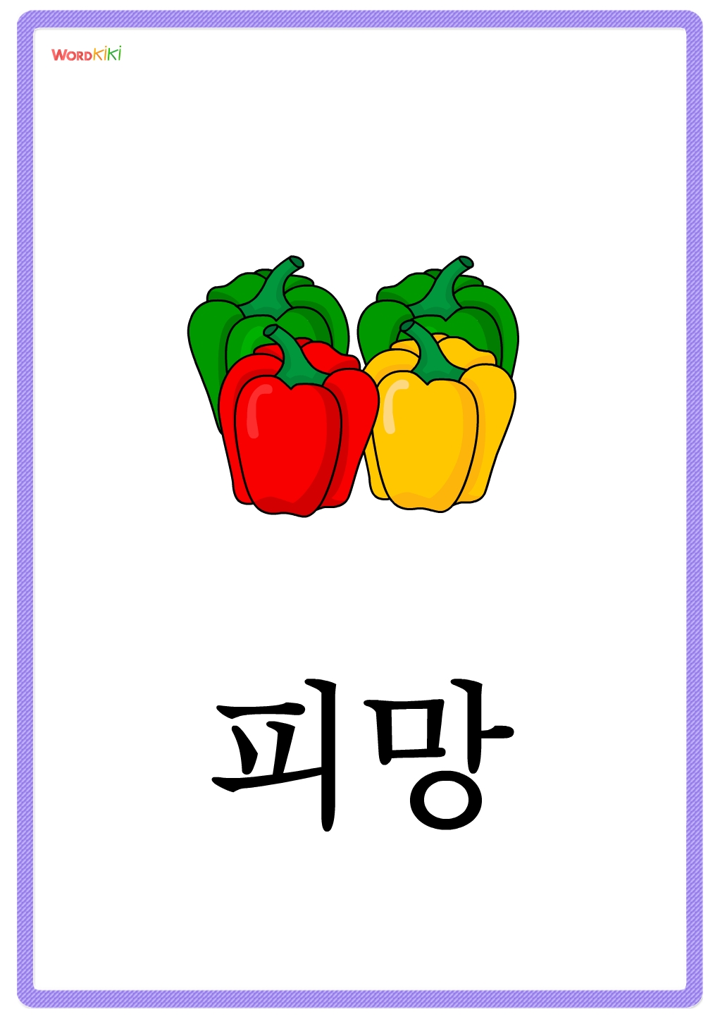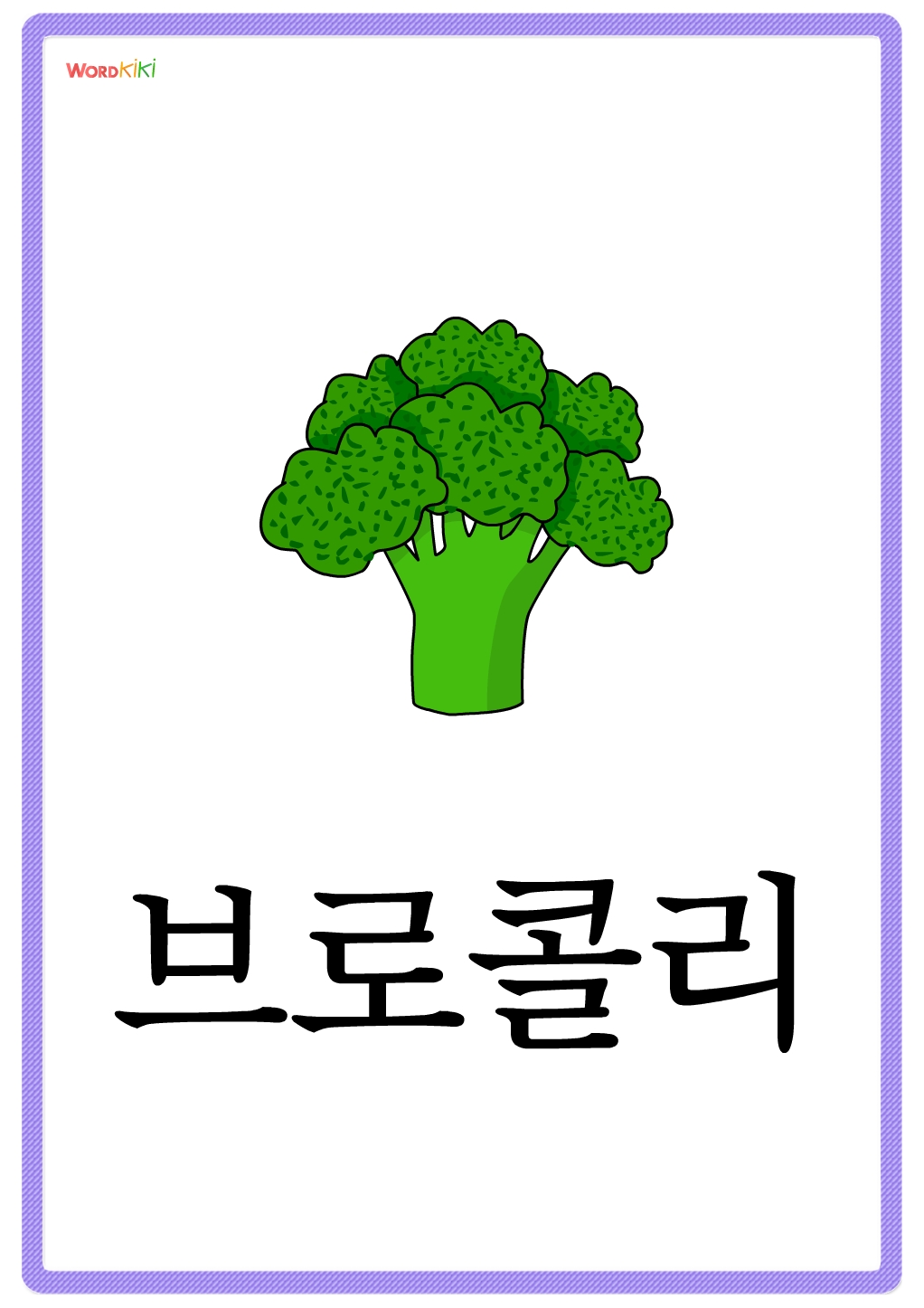 오이,무,당근,시금치,가지,호박,피망,고추,양파,감자,고구마,콩,마늘,버섯,토마토,배추,연근,생강,브로콜리,양배추,밤 등 야채와 관련된 한글 플래시카드 만들기 입니다.