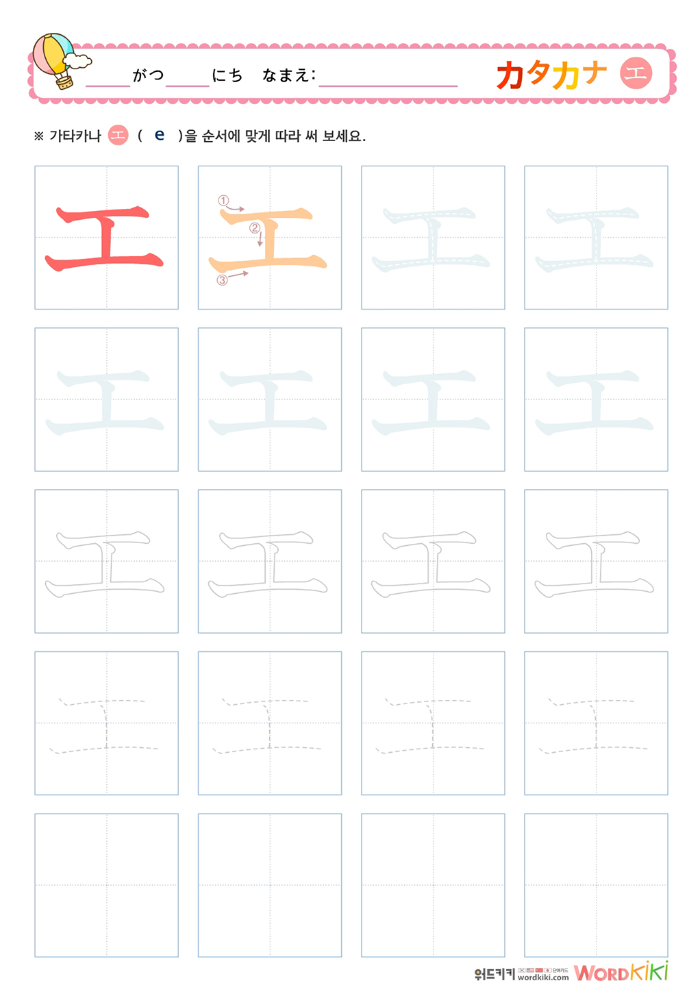가타카나 カタカナ 따라쓰기 무료프린트학습지로 가타카나 쓰기 연습장입니다.