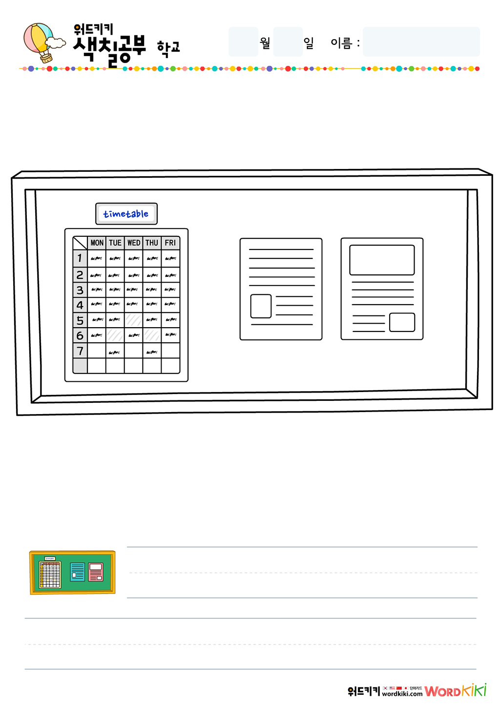 책상 색칠하기 그림, 의자 색칠하기 그림, 책장 색칠하기 그림, 사물함 색칠하기 그림, 게시판 색칠하기 그림, 소화기 색칠하기 그림, 시간표 색칠하기 그림, 쓰레기통 색칠하기 도안