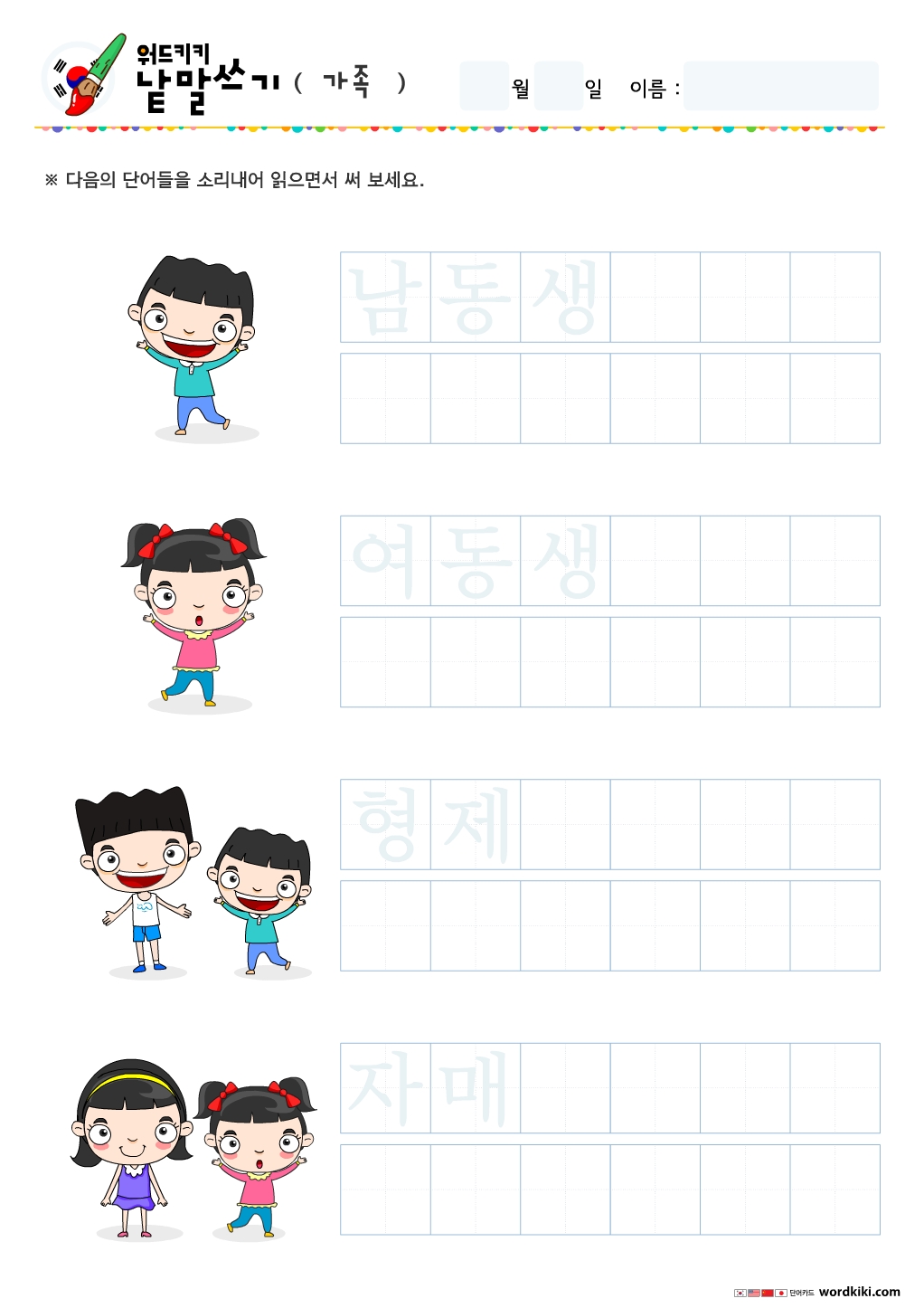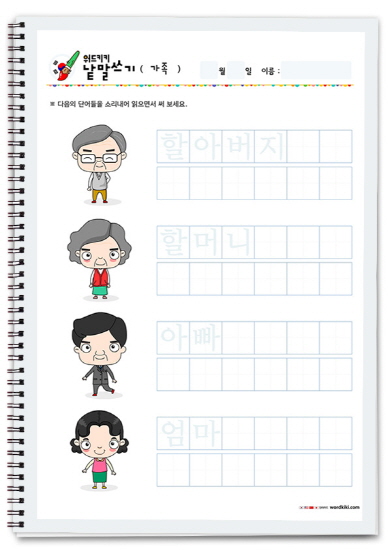 오늘 써볼 단어는 가족 테마의 한글 단어입니다.단어를 따라 써 보고, 빈칸을 채워 보세요.