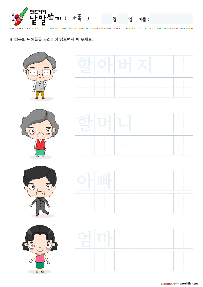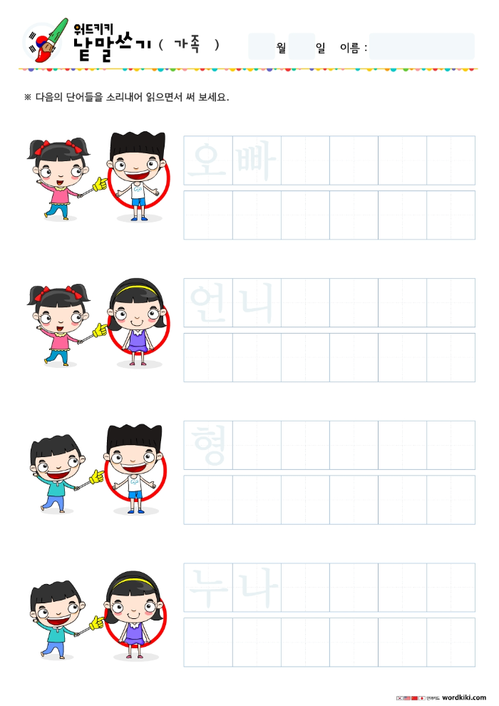 오늘 써볼 단어는 가족 테마의 한글 단어입니다.단어를 따라 써 보고, 빈칸을 채워 보세요.