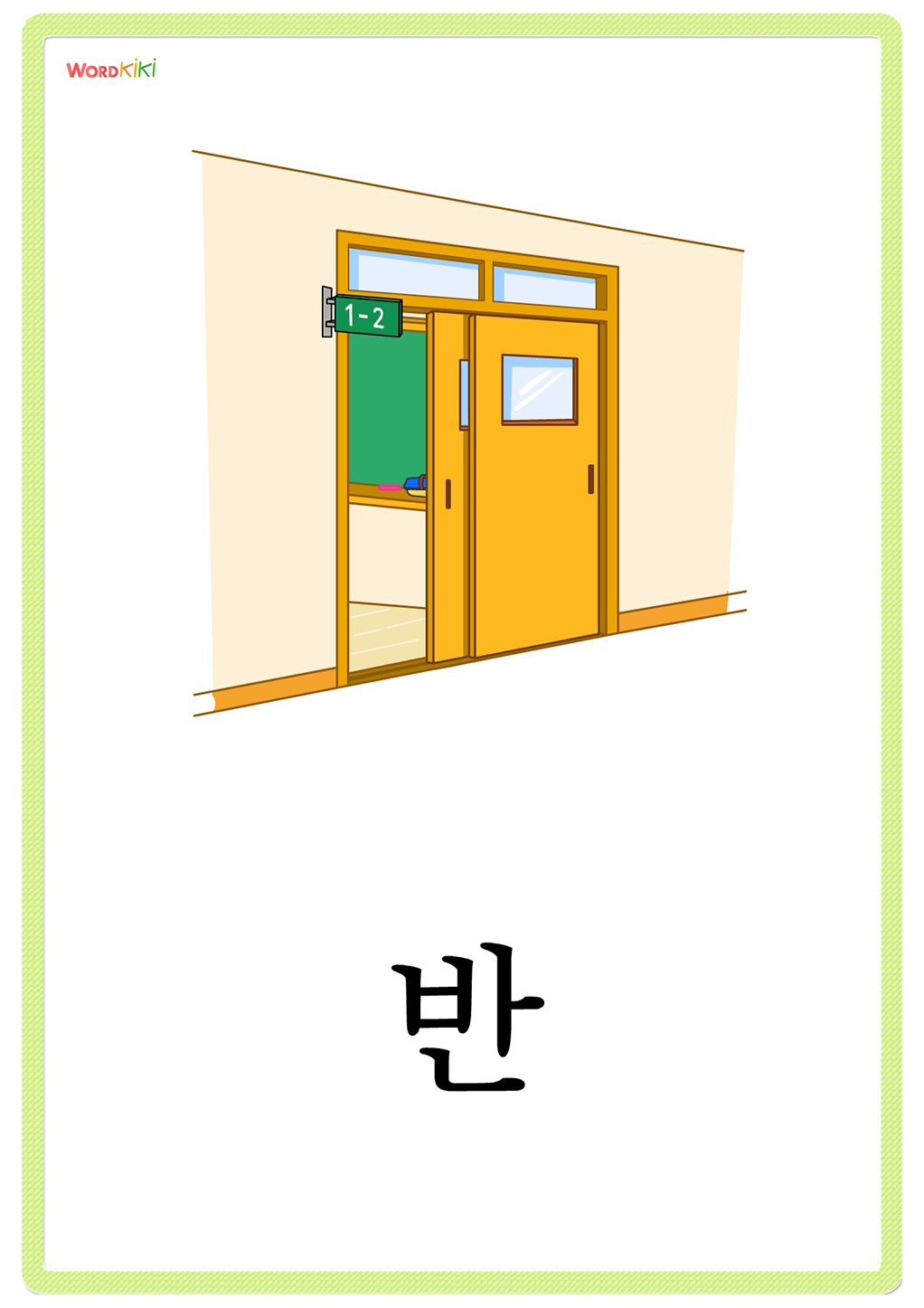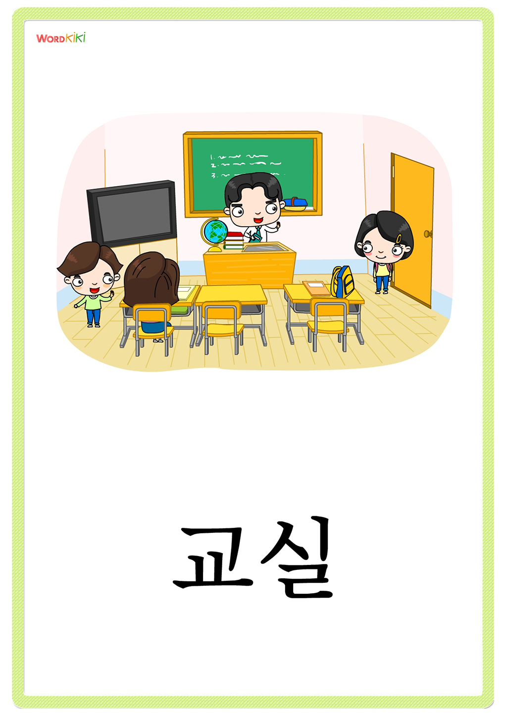 교실,반,교사,지구본,칠판,지우개,분필,책,출석부,학생,책상,의자,책장,사물함,게시판,소화기,시간표,쓰레기통