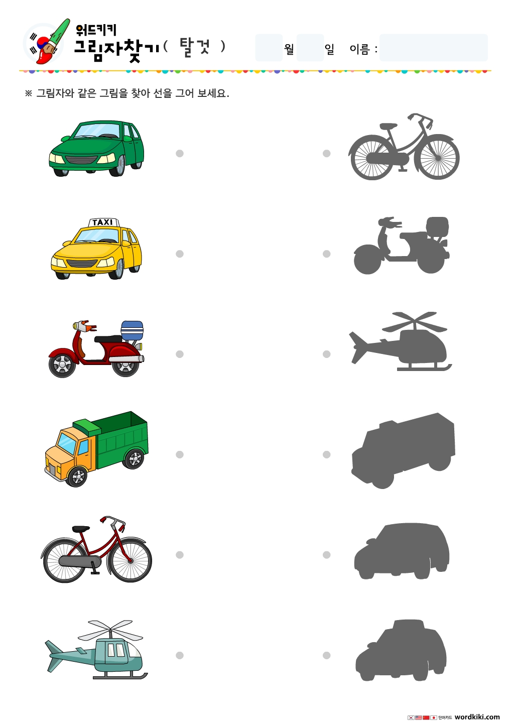 비행기 선긋기, 기차 선긋기,  배, 선긋기,  스쿨버스 선긋기,  버스 선긋기,  자동차 선긋기,  택시 선긋기,  오토바이 선긋기,  트럭 선긋기,  자전거 선긋기,  헬리콥터 선긋기