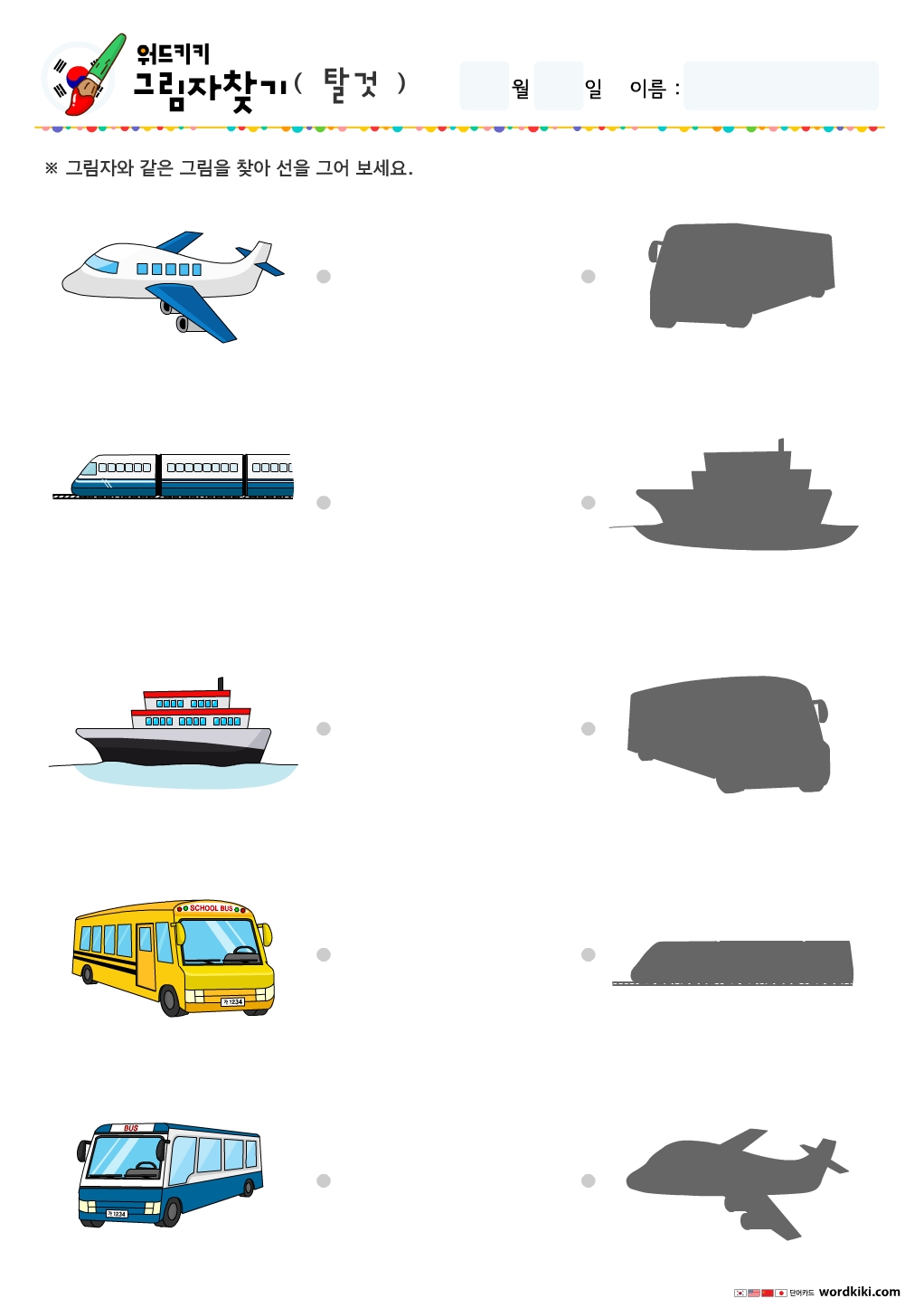비행기 선긋기, 기차 선긋기, 배, 선긋기, 스쿨버스 선긋기, 버스 선긋기, 자동차 선긋기, 택시 선긋기, 오토바이 선긋기, 트럭 선긋기, 자전거 선긋기, 헬리콥터 선긋기