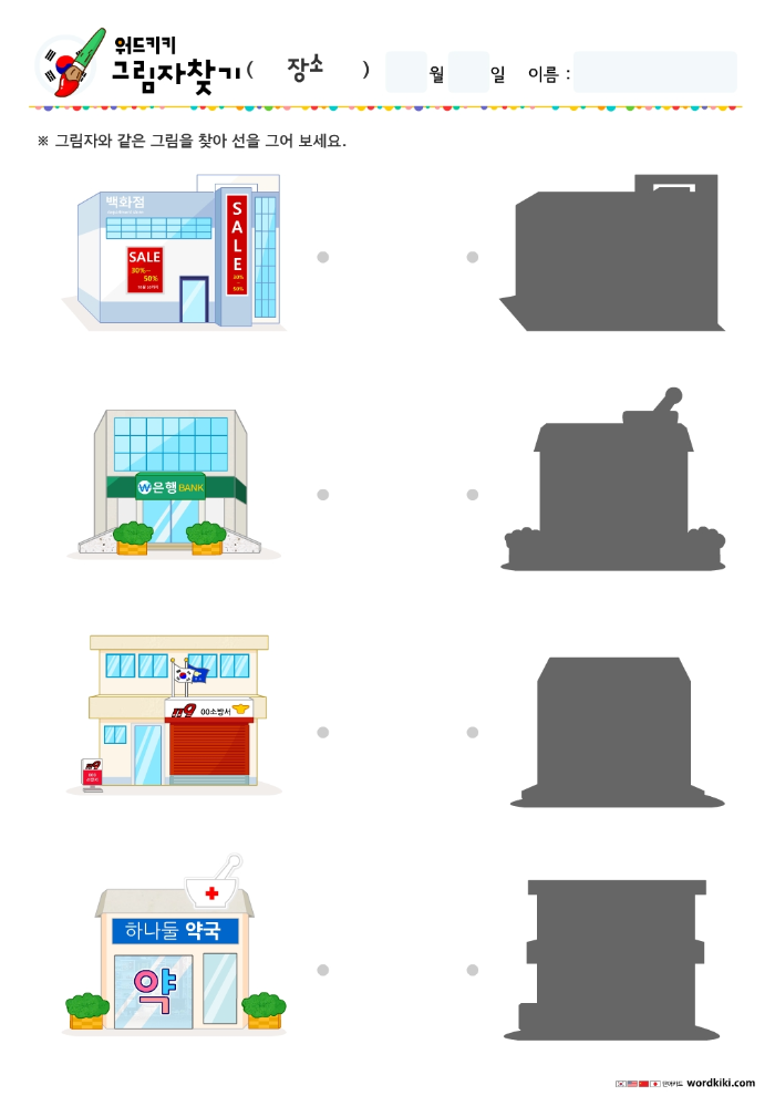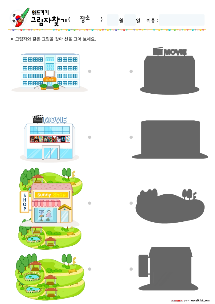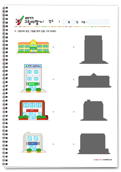 한글장소그림자찾기/무료프린트학습지/엄마표활동지/장소테마어린이활동지/유아한글단어장소/그림자연결하기/엄마표한글학습/홈스쿨자료
