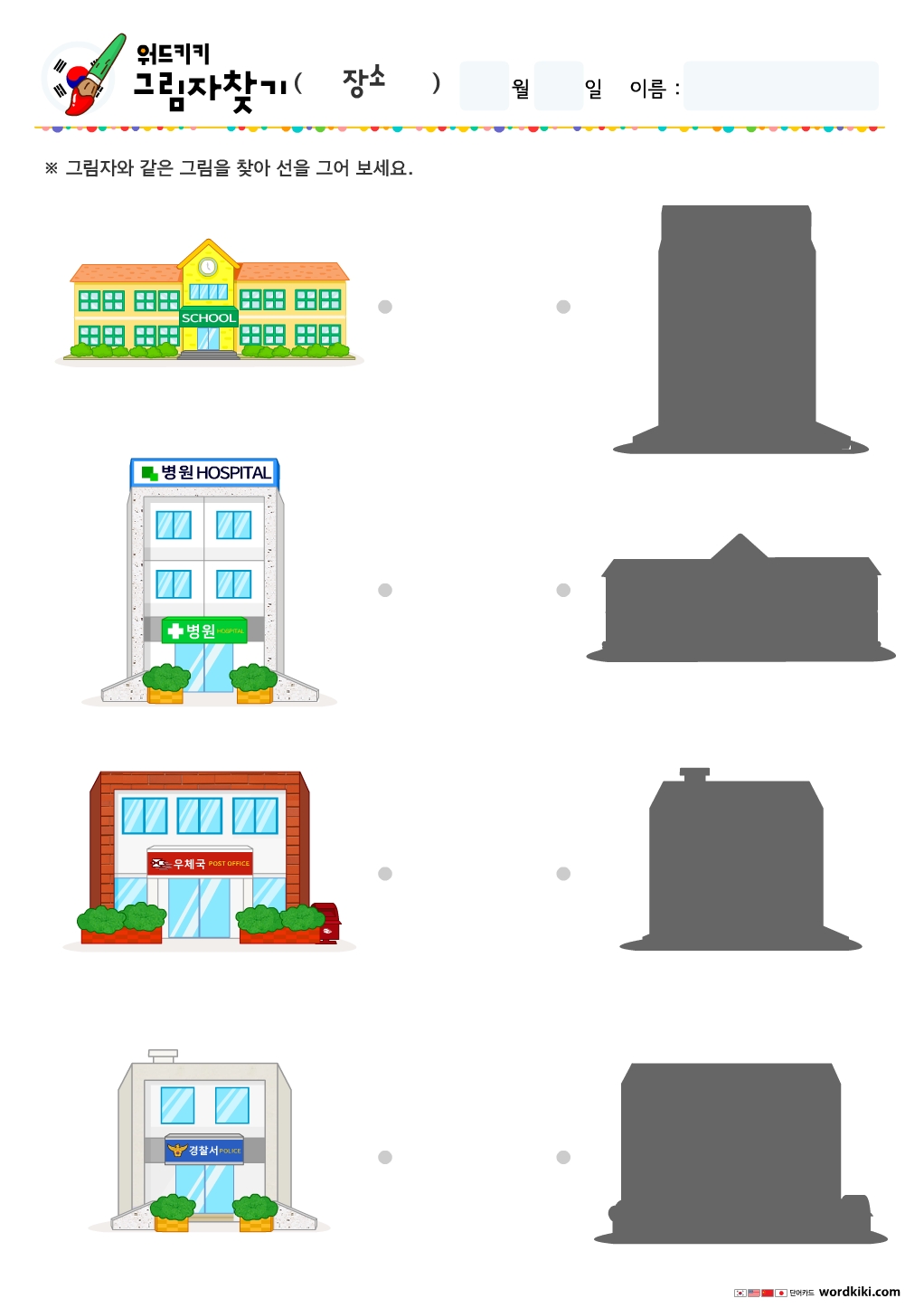 한글장소그림자찾기/무료프린트학습지/엄마표활동지/장소테마어린이활동지/유아한글단어장소/그림자연결하기/엄마표한글학습/홈스쿨자료
