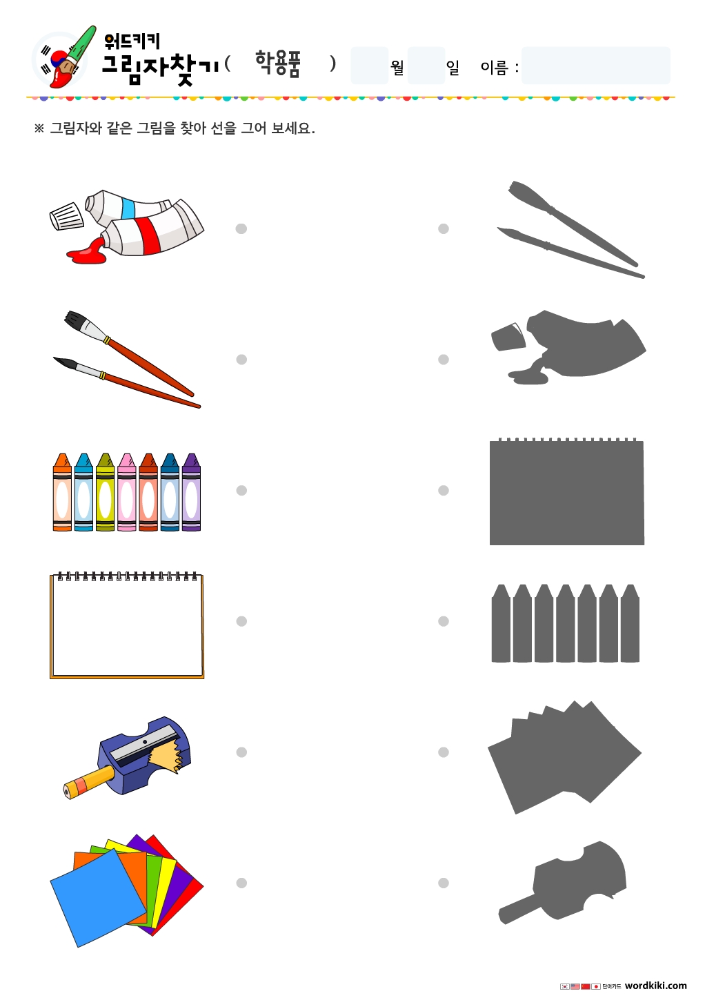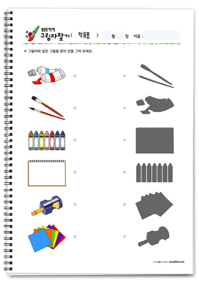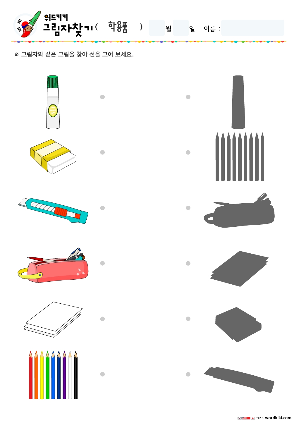 연필 그림자찾기, 공책 그림자찾기, 볼펜 그림자찾기, 가위 그림자찾기, 샤프펜슬 그림자찾기, 자 그림자찾기, 풀 그림자찾기, 지우개 그림자찾기, 칼 그림자찾기, 필통 그림자찾기, 종이 그림자찾기, 색연필 그림자찾기, 물감 그림자찾기, 붓 그림자찾기, 크레파스 그림자찾기, 스케치북 그림자찾기, 연필깍이 그림자찾기, 색종이 그림자찾기,