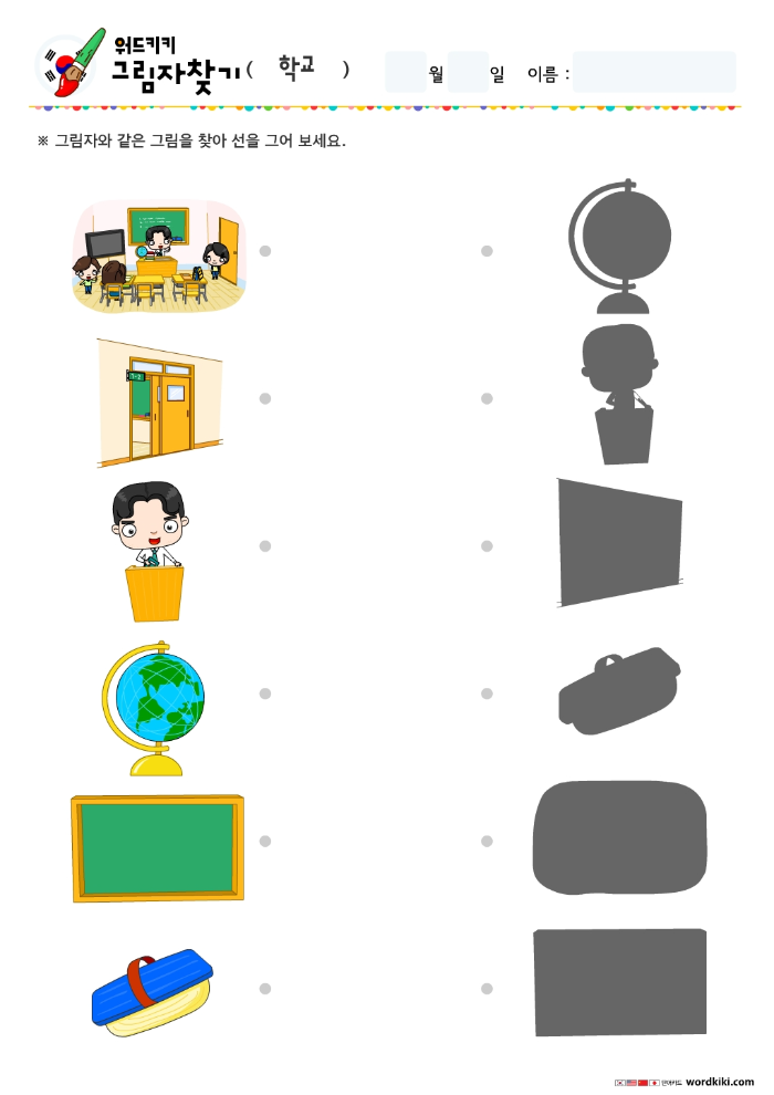 교실,반,교사,지구본,칠판 등 그림을 보고 그림과 맞는 그림자를 찾아 선으로 연결 해 보세요.