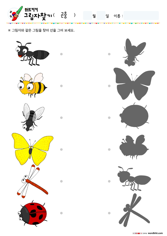 개미,벌,파리,나비,잠자리 등 그림을 보고 그림과 맞는 그림자를 찾아 선으로 연결 해 보세요.