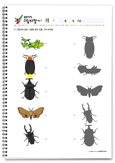 개미 선긋기,벌 그림자찾기, 파리 그림자찾기, 나비 그림자찾기, 잠자리 그림자찾기, 무당벌레 그림자찾기, 거미 그림자찾기, 지렁이, 그림자찾기, 매미그림자찾기, 모기 그림자찾기, 사마귀 그림자찾기, 메뚜기 그림자찾기, 반딧불이 그림자찾기, 장수풍뎅이 그림자찾기, 나방 그림자찾기, 사슴벌레 그림자찾기