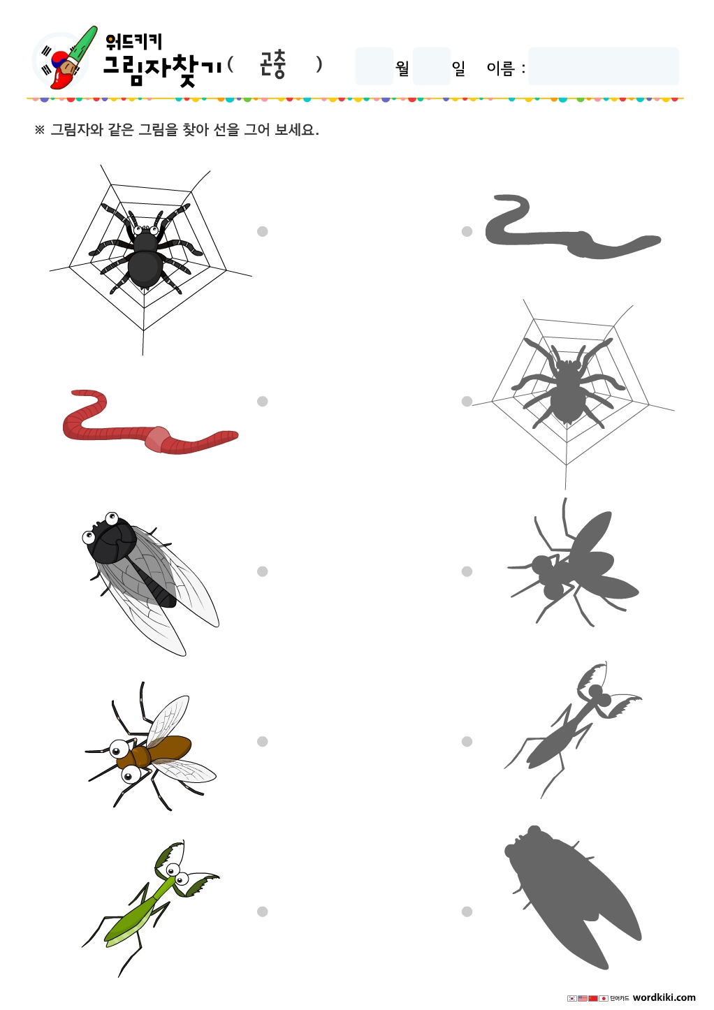 개미,벌,파리,나비,잠자리 등 그림을 보고 그림과 맞는 그림자를 찾아 선으로 연결 해 보세요.