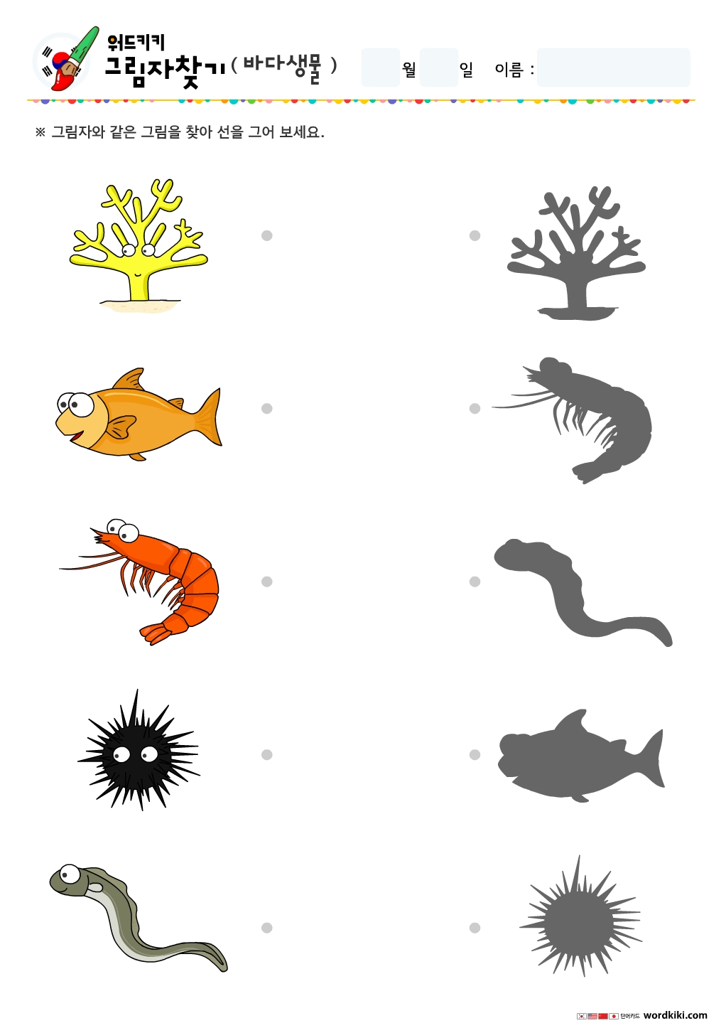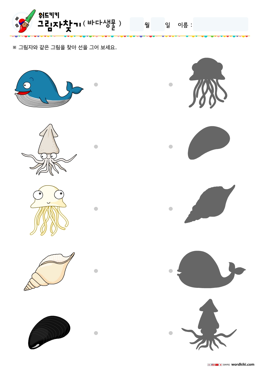 한글 바다생물 그림자찾기/무료프린트학습지/엄마표활동지/어린이활동지/유아한글단어/ 바다생물 그림자연결하기/엄마표한글학습/홈스쿨자료 바다생물