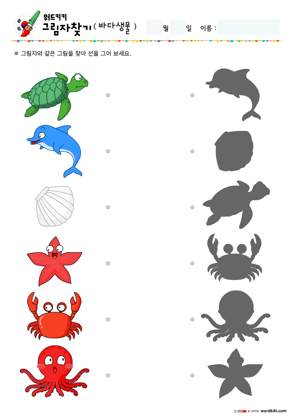거북이,돌고래,조개,불가사리,게 등 그림을 보고 그림과 맞는 그림자를 찾아 선으로 연결 해 보세요.