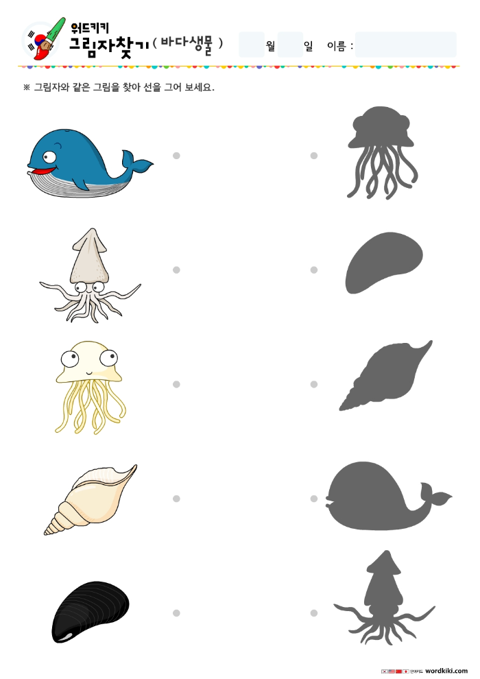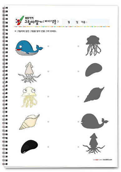 한글 바다생물 그림자찾기/무료프린트학습지/엄마표활동지/어린이활동지/유아한글단어/ 바다생물 그림자연결하기/엄마표한글학습/홈스쿨자료 바다생물