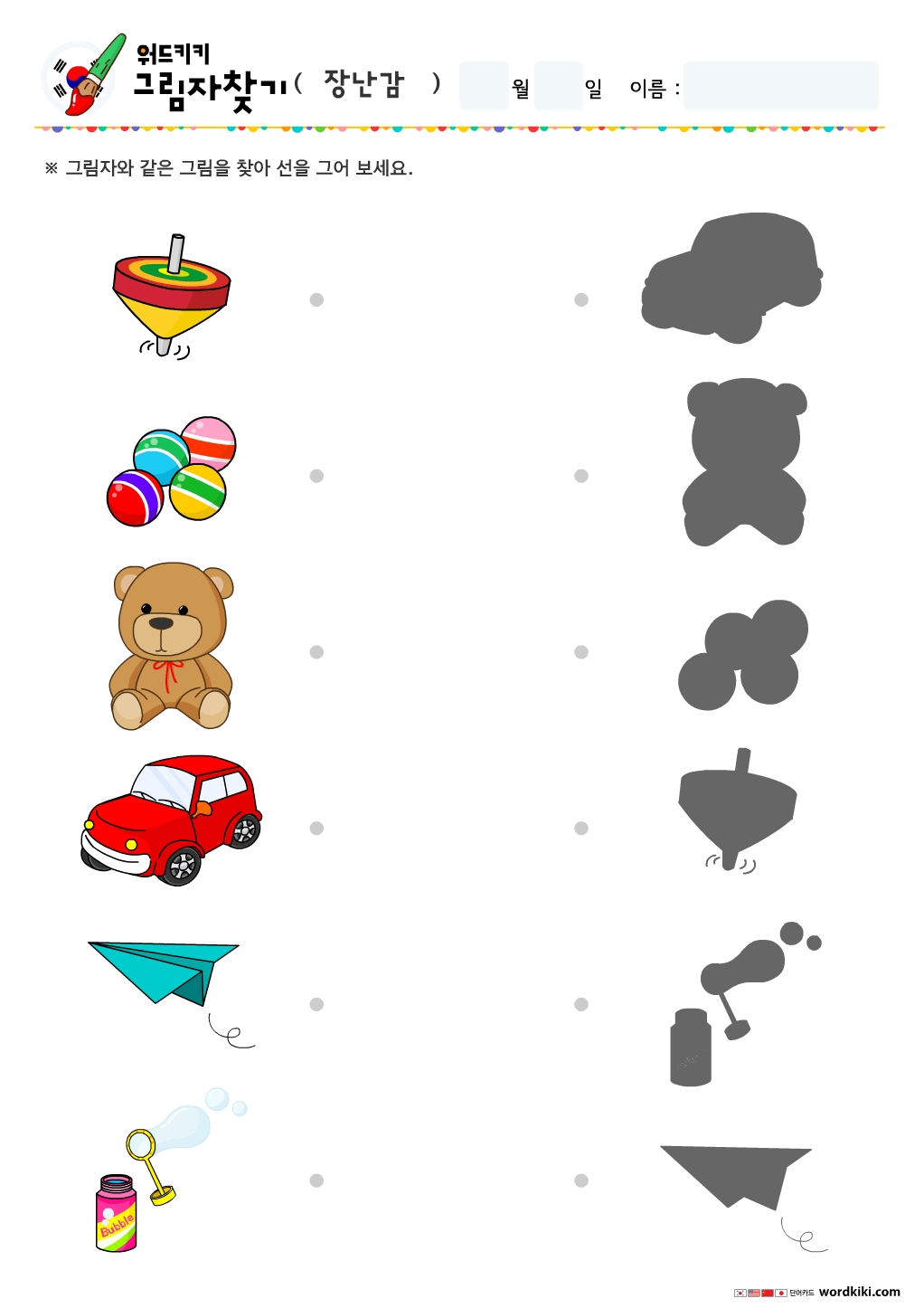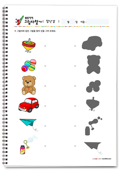 주사위 선긋기, 요요 그림자 연결하기, 블록 그림자 연결하기, 자석 그림자 연결하기, 공 그림자 연결하기, 풍선 그림자 연결하기, 연 그림자 연결하기, 로봇 그림자 연결하기, 크레용 그림자 연결하기, 인형 그림자 연결하기, 퍼즐 그림자 연결하기, 검 그림자 연결하기, 팽이 그림자 연결하기, 구슬 그림자 연결하기, 곰인형 그림자 연결하기, 장난감 자동차 그림자 연결하기, 종이비행기 그림자 연결하기, 비눗방울 그림자찾기