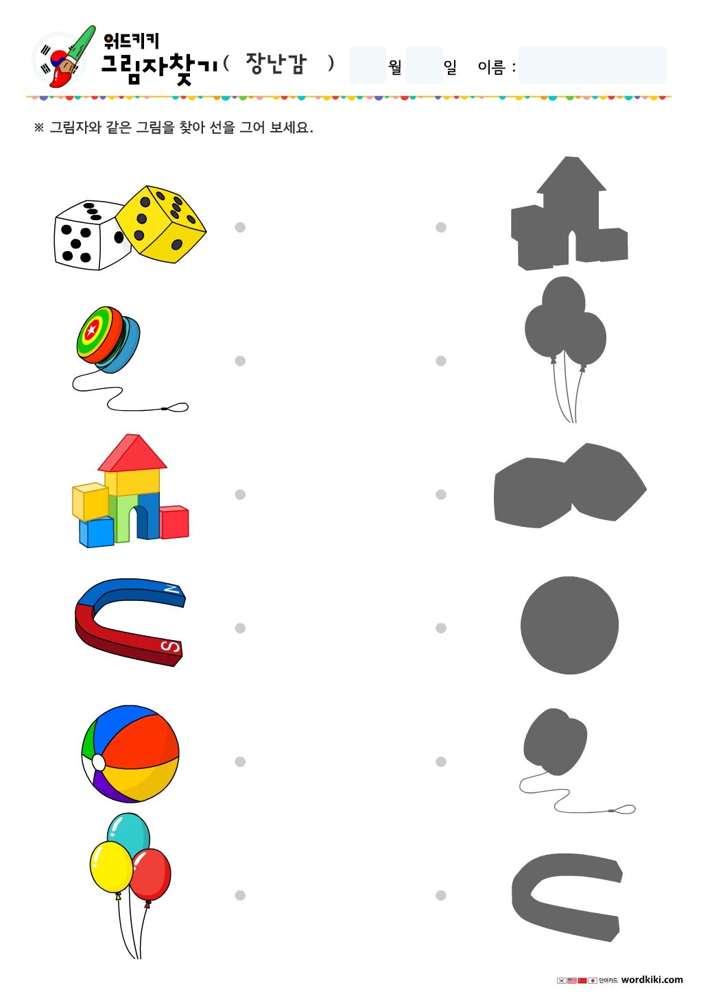 주사위,요요,블록,자석,공,풍선 등 그림을 보고 그림과 맞는 그림자를 찾아 선으로 연결 해 보세요.