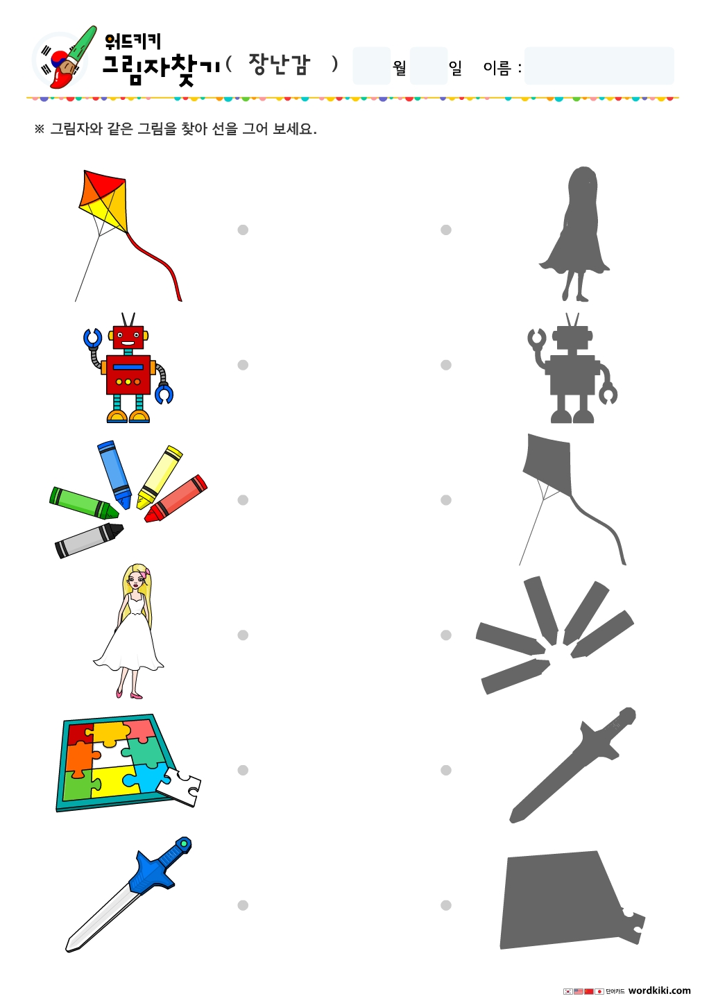 주사위 선긋기, 요요 그림자 연결하기, 블록 그림자 연결하기, 자석 그림자 연결하기, 공 그림자 연결하기, 풍선 그림자 연결하기, 연 그림자 연결하기, 로봇 그림자 연결하기, 크레용 그림자 연결하기, 인형 그림자 연결하기, 퍼즐 그림자 연결하기, 검 그림자 연결하기, 팽이 그림자 연결하기, 구슬 그림자 연결하기, 곰인형 그림자 연결하기, 장난감 자동차 그림자 연결하기, 종이비행기 그림자 연결하기, 비눗방울 그림자찾기