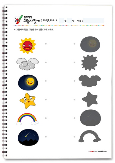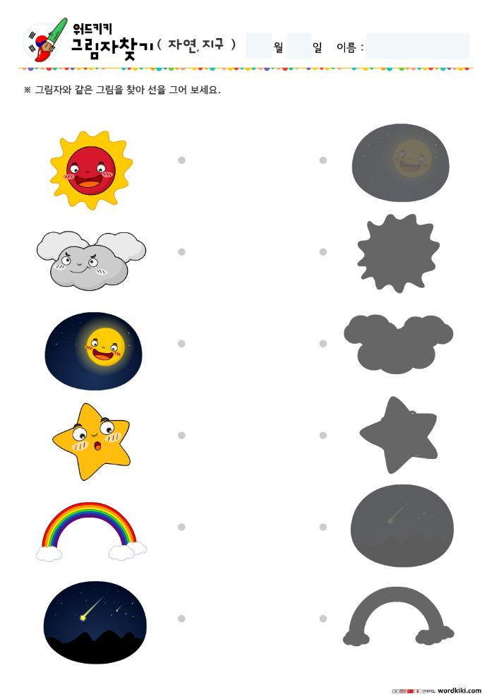 태양,구름,달,별,무지개,유성 등그림을 보고 그림과 맞는 그림자를 찾아 선으로 연결 해 보세요.