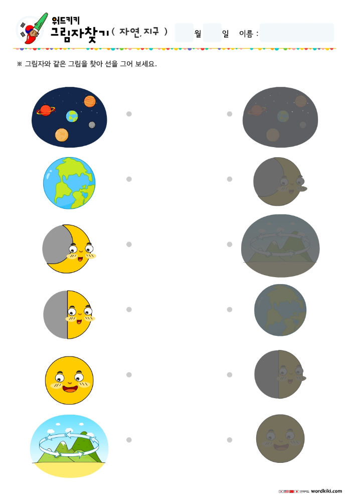 한글자연,지구그림자찾기/무료프린트학습지/엄마표활동지/어린이활동지/유아한글단어/자연,지구그림자연결하기/엄마표한글학습/홈스쿨자료자연,지구