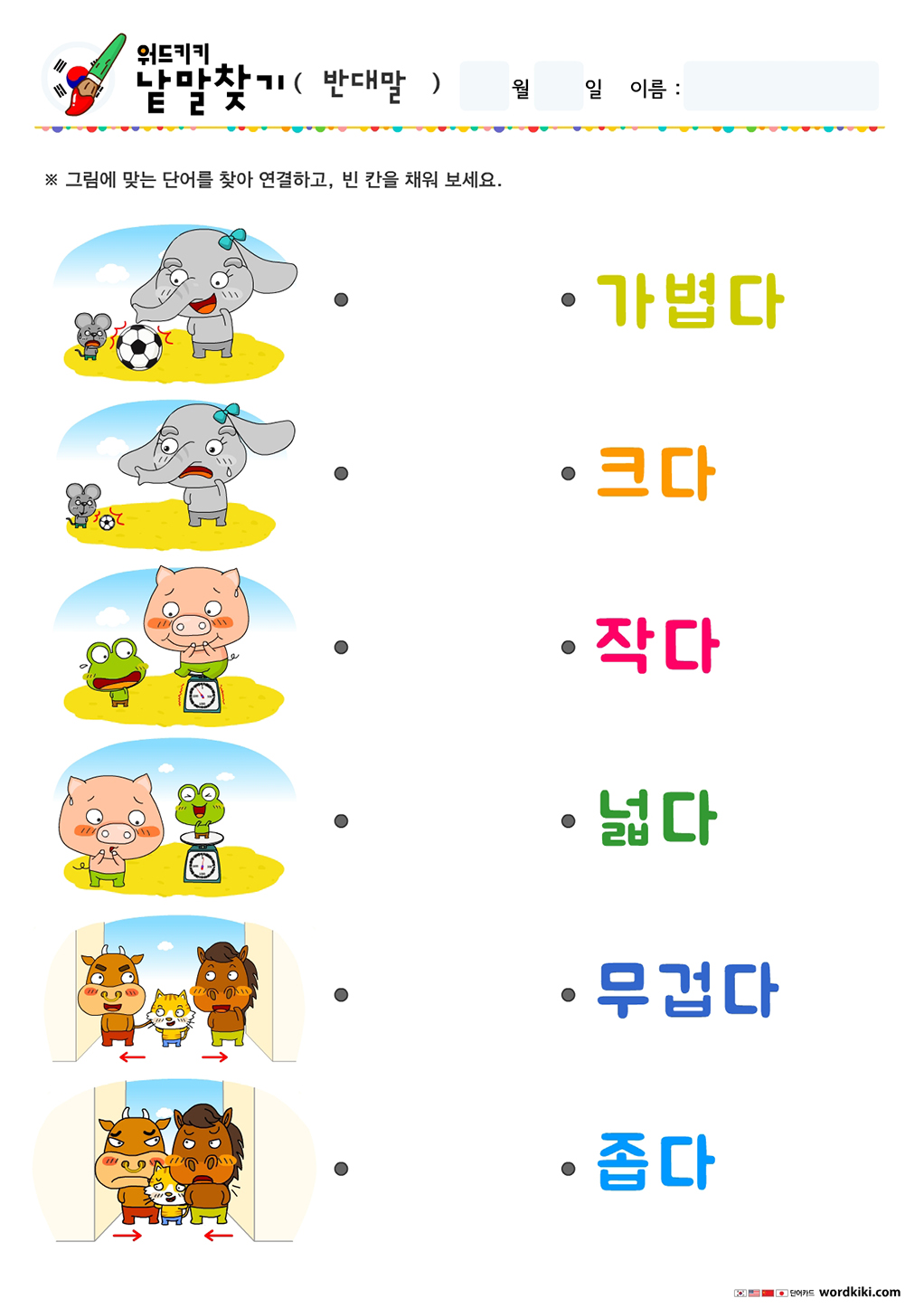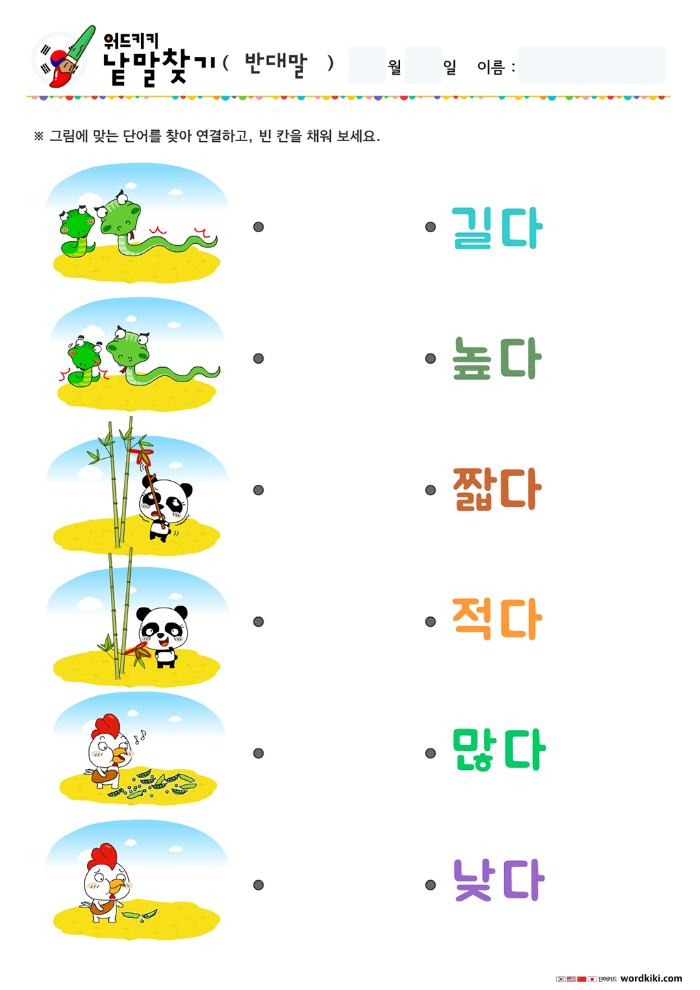 크다작다 반대말 낱말찾기,무겁다가볍다 반대말 단어찾기, 넓다좁다 반대말 낱말찾기, 길다짧다 반대말 낱말찾기, 높다낮다 반대말 낱말찾기, 많다적다 반대말 낱말찾기, 깨끗하다더럽다 반대말 낱말찾기, 빠르다느리다 반대말 낱말찾기, 가득하다텅비다 반대말 낱말찾기.