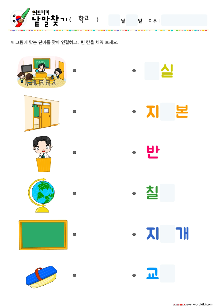 교실 낱말찾기, 반 학교쓰기, 교사 단어쓰기, 지구본 단어찾기, 칠판 낱말찾기, 지우개 낱말찾기, 분필 낱말찾기, 책 낱말찾기, 출석부 낱말찾기, 학생 낱말찾기, 책상 낱말찾기, 의자 낱말찾기, 책장 낱말찾기, 사물함 낱말찾기, 게시판 낱말찾기, 소화기 낱말찾기, 시간표 낱말찾기, 쓰레기통 낱말찾기.