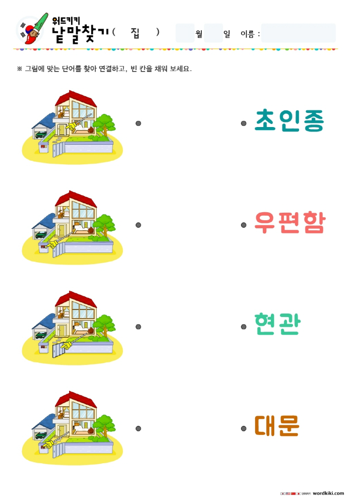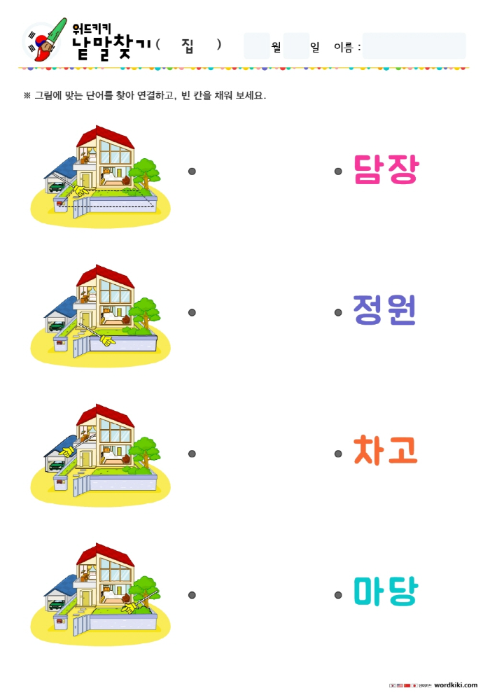 집 낱말쓰기, 지붕 낱말찾기, 창문 단어찾기, 방 집 선긋기, 발코니 낱말찾기, 거실 낱말찾기, 벽 낱말찾기, 문 낱말찾기, 현관 낱말찾기, 초인종 낱말찾기, 대문 낱말찾기, 우편함 낱말찾기, 마당 낱말찾기, 담장 낱말찾기, 차고 낱말찾기, 정원 낱말찾기, 집 낱말찾기.