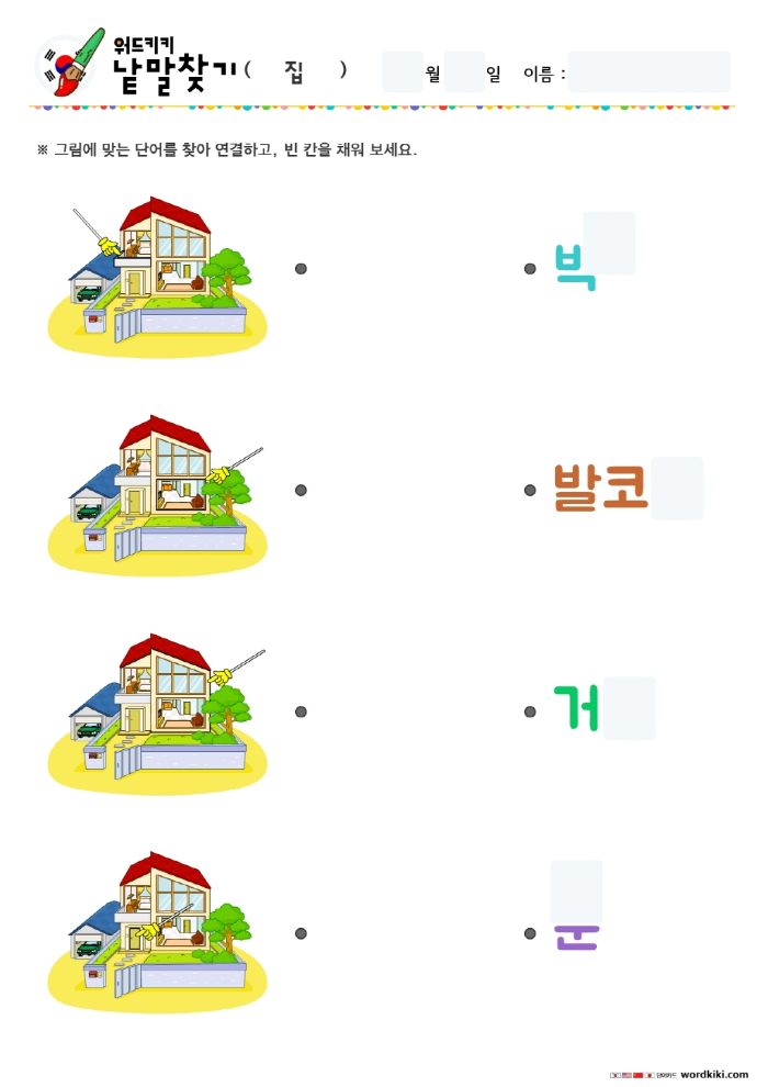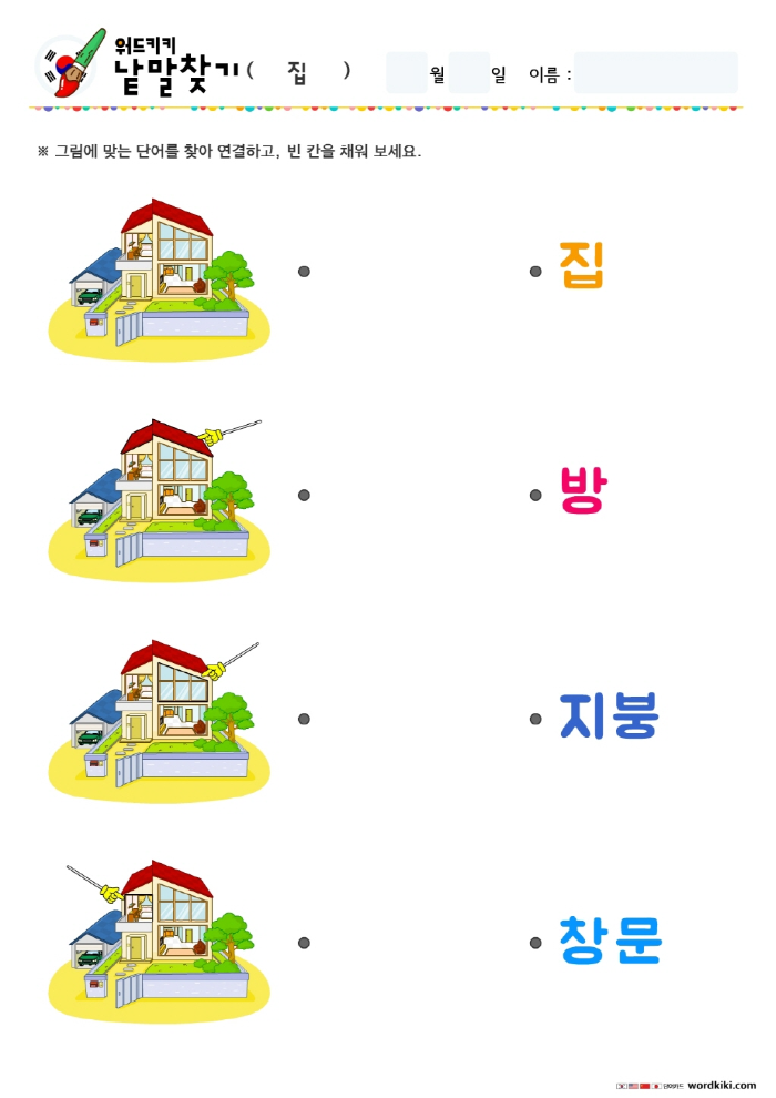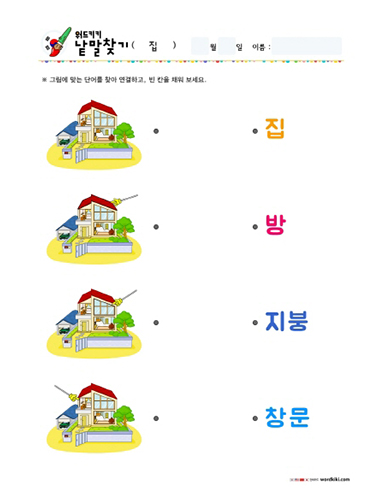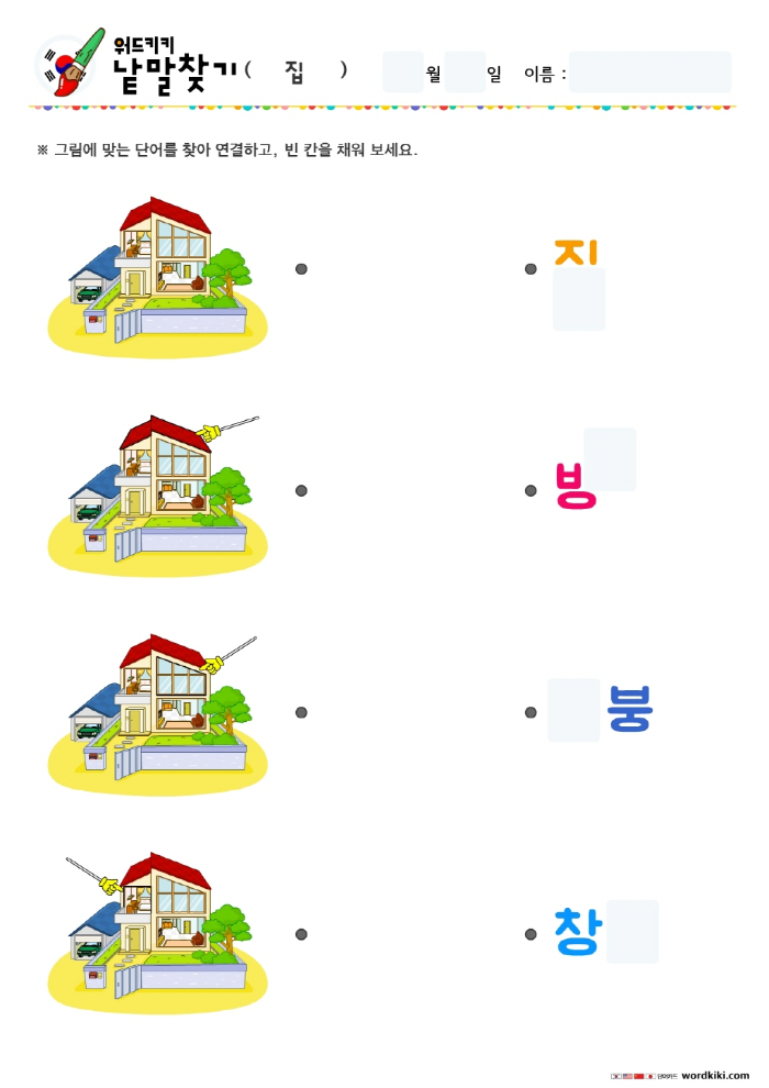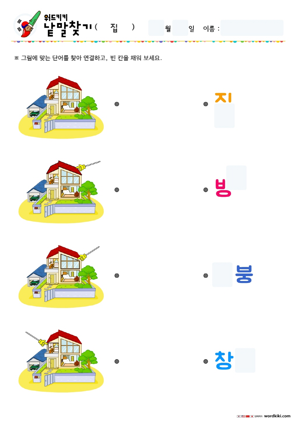 집 낱말쓰기, 지붕 낱말찾기, 창문 단어찾기, 방 집 선긋기, 발코니 낱말찾기, 거실 낱말찾기, 벽 낱말찾기, 문 낱말찾기, 현관 낱말찾기, 초인종 낱말찾기, 대문 낱말찾기, 우편함 낱말찾기, 마당 낱말찾기, 담장 낱말찾기, 차고 낱말찾기, 정원 낱말찾기, 집 낱말찾기.
