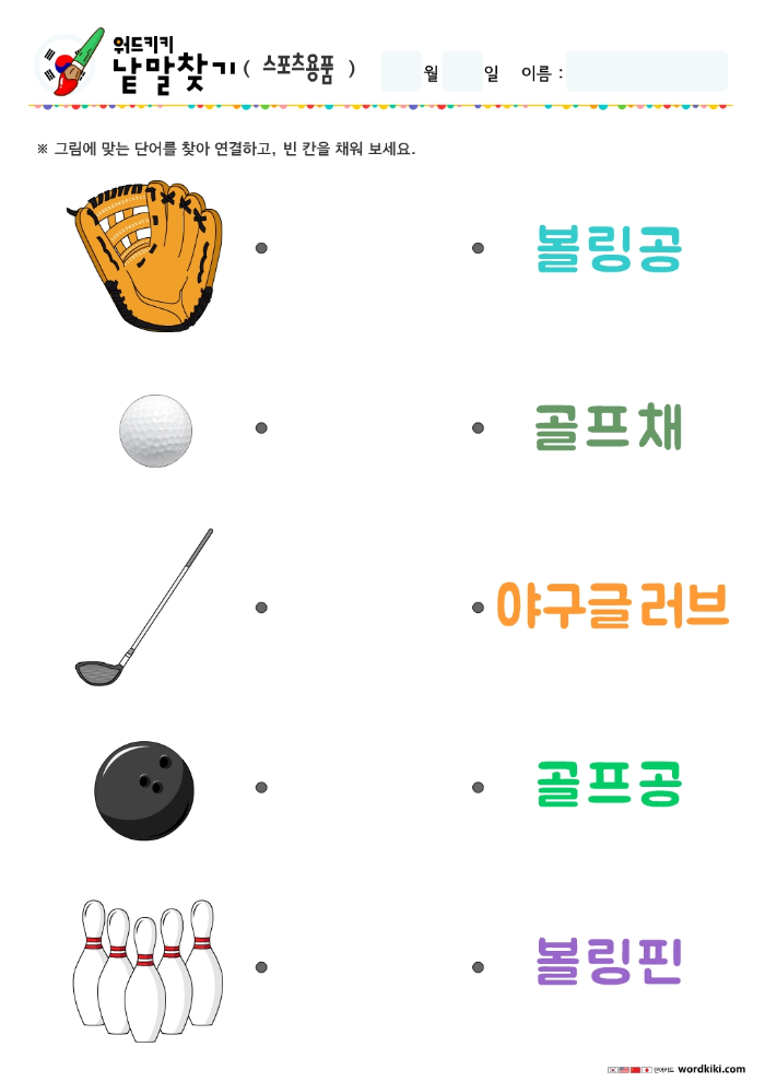 스포츠용품 단어에 알맞는 그림을 찾아, 선긋기와 단어쓰기를 한번에!