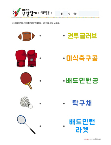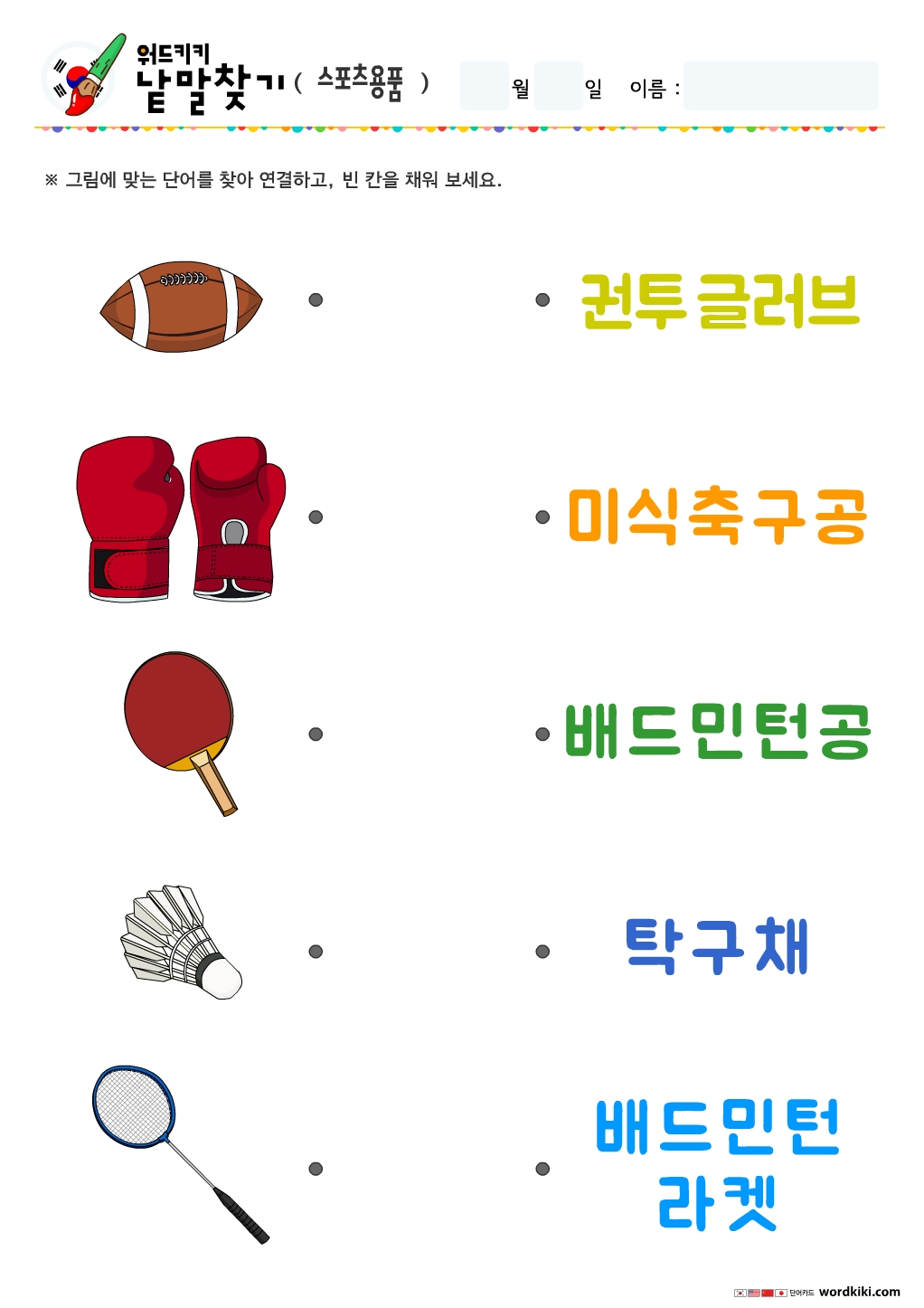 스포츠용품 단어에 알맞는 그림을 찾아, 선긋기와 단어쓰기를 한번에!