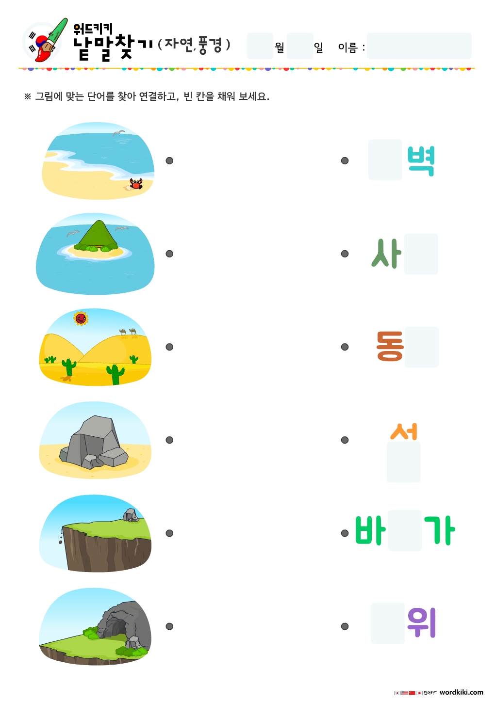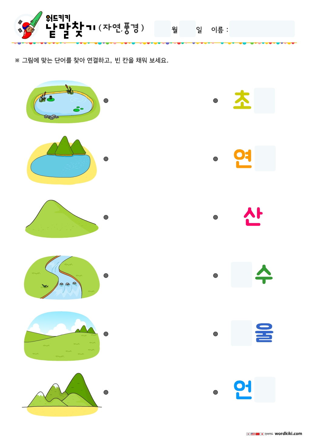 자연풍경 단어에 알맞는 그림을 찾아, 선긋기와 단어쓰기를 한번에!