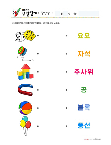 장난감 단어에 알맞는 그림을 찾아, 선긋기와 단어쓰기를 한번에!