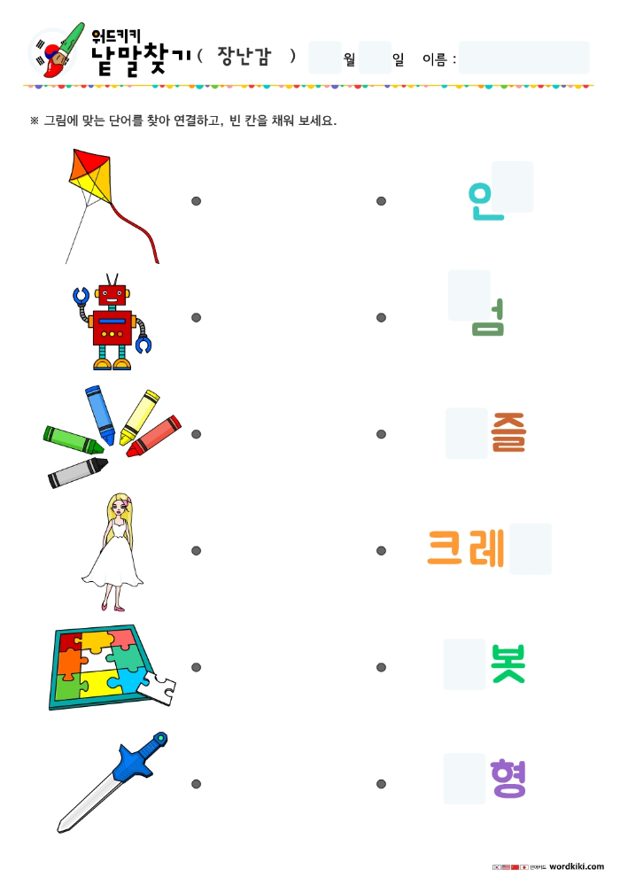 [한글 활동지 6장] 37 장난감 단어연결하기