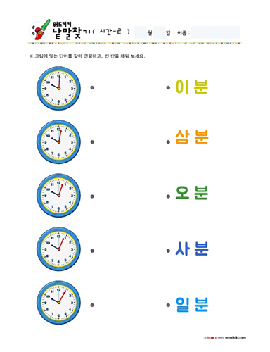 시간(분) 단어에 알맞는 그림을 찾아, 선긋기와 단어쓰기를 한번에!