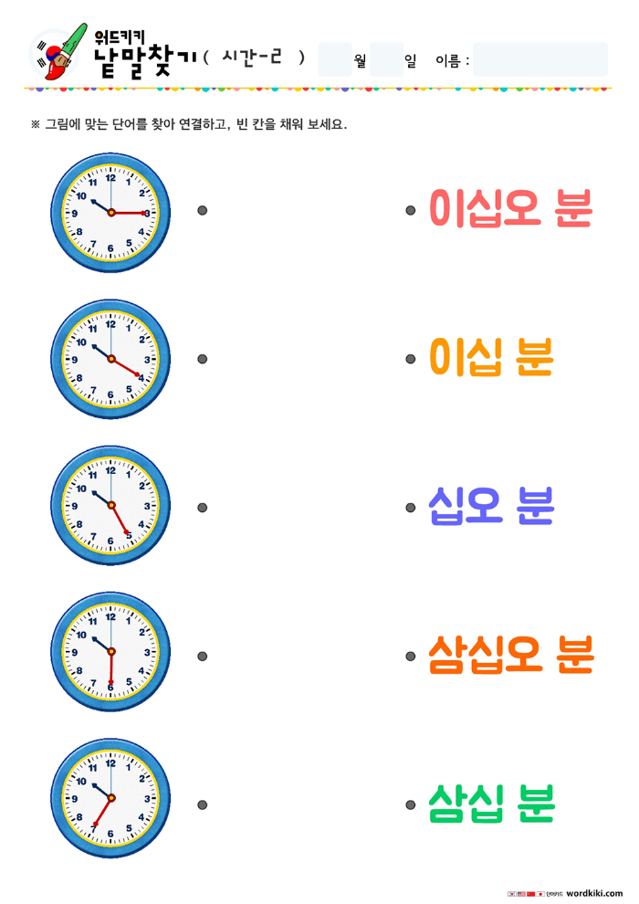 [한글 활동지 4장] 22-2 시간(분) 단어연결하기