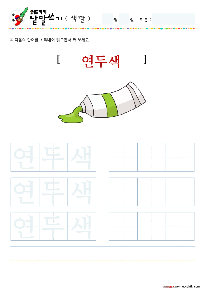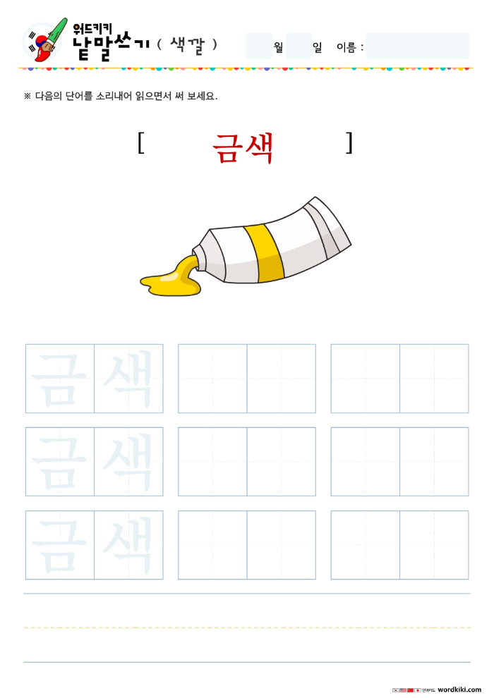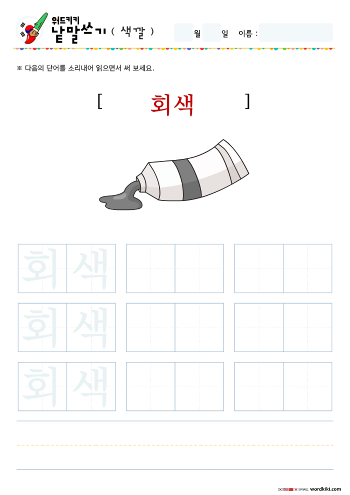 | [한글단어쓰기 10장] 05-1 한국어 색깔 단어쓰기 (큰글자1) - korean Writing - Color (0) | 2024.05.23 |