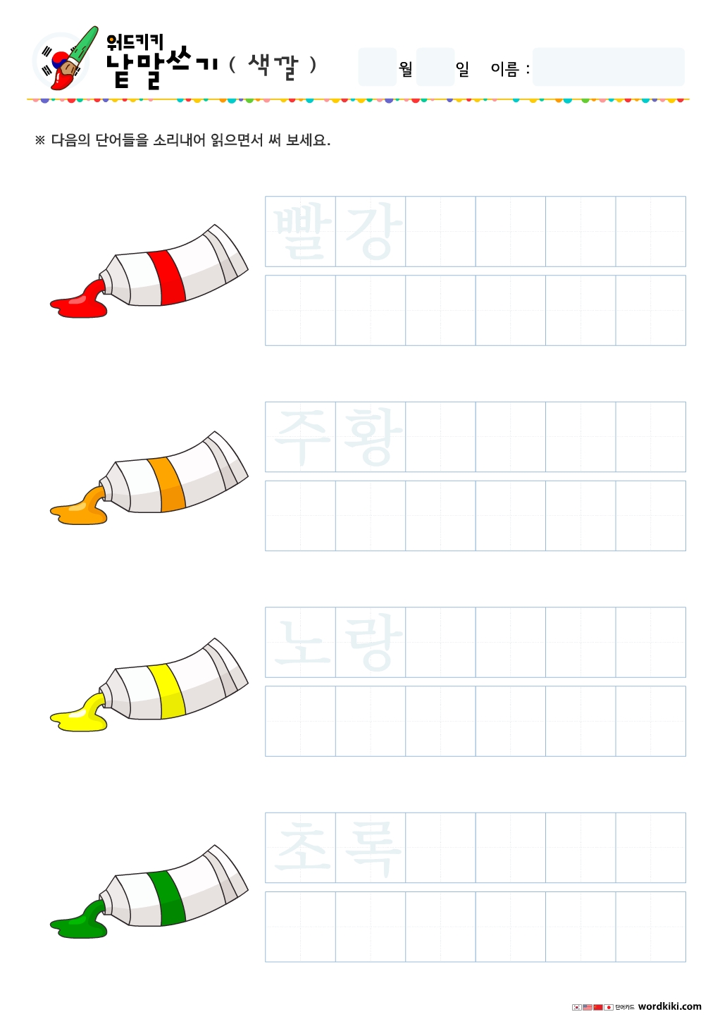 | [한글단어쓰기 8장] 05-1 한국어 색깔 단어쓰기 (큰글자2) - korean Writing - Color (0) | 2024.05.23 |