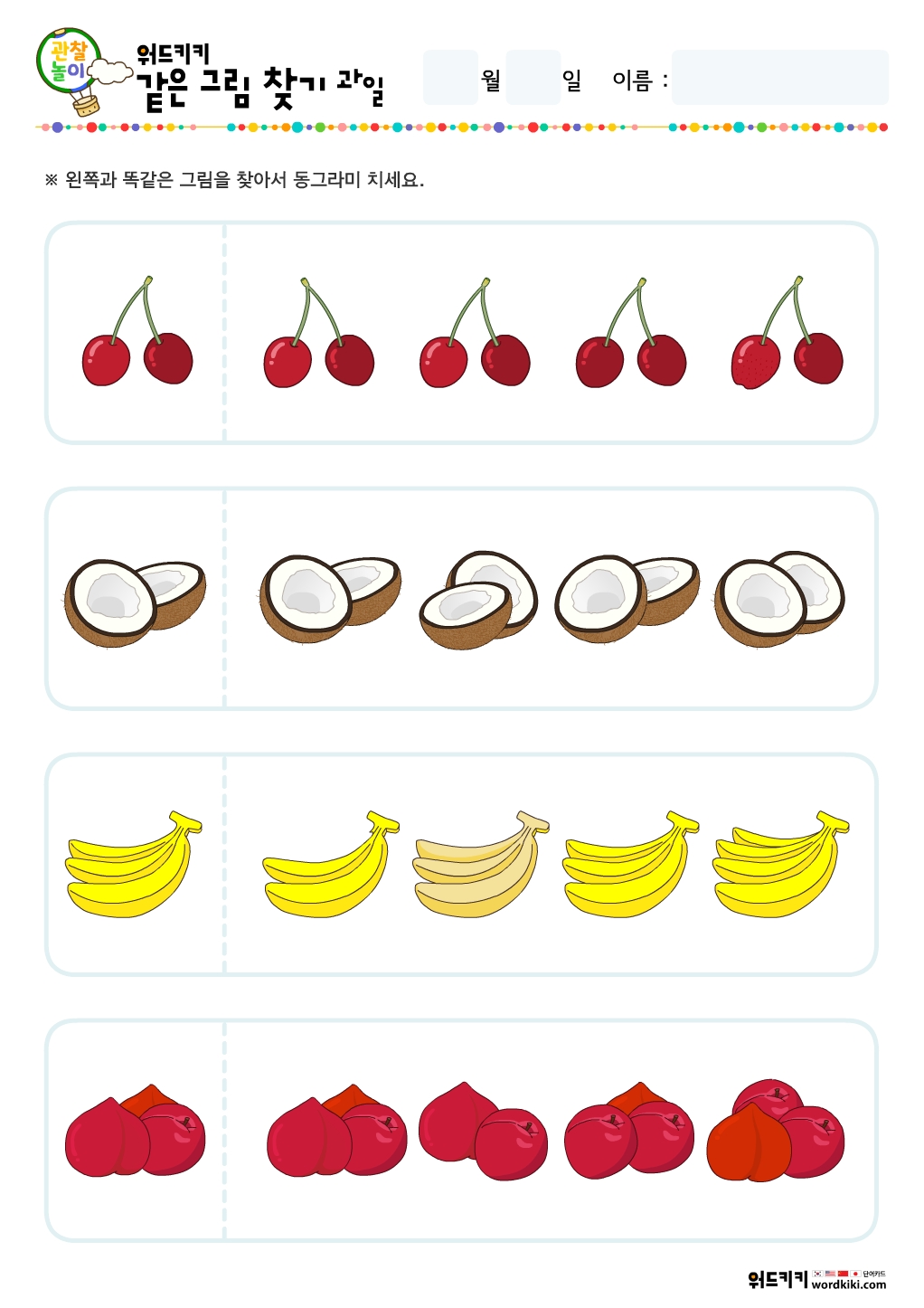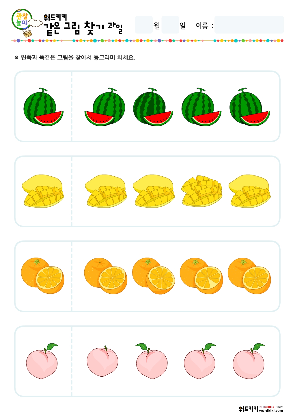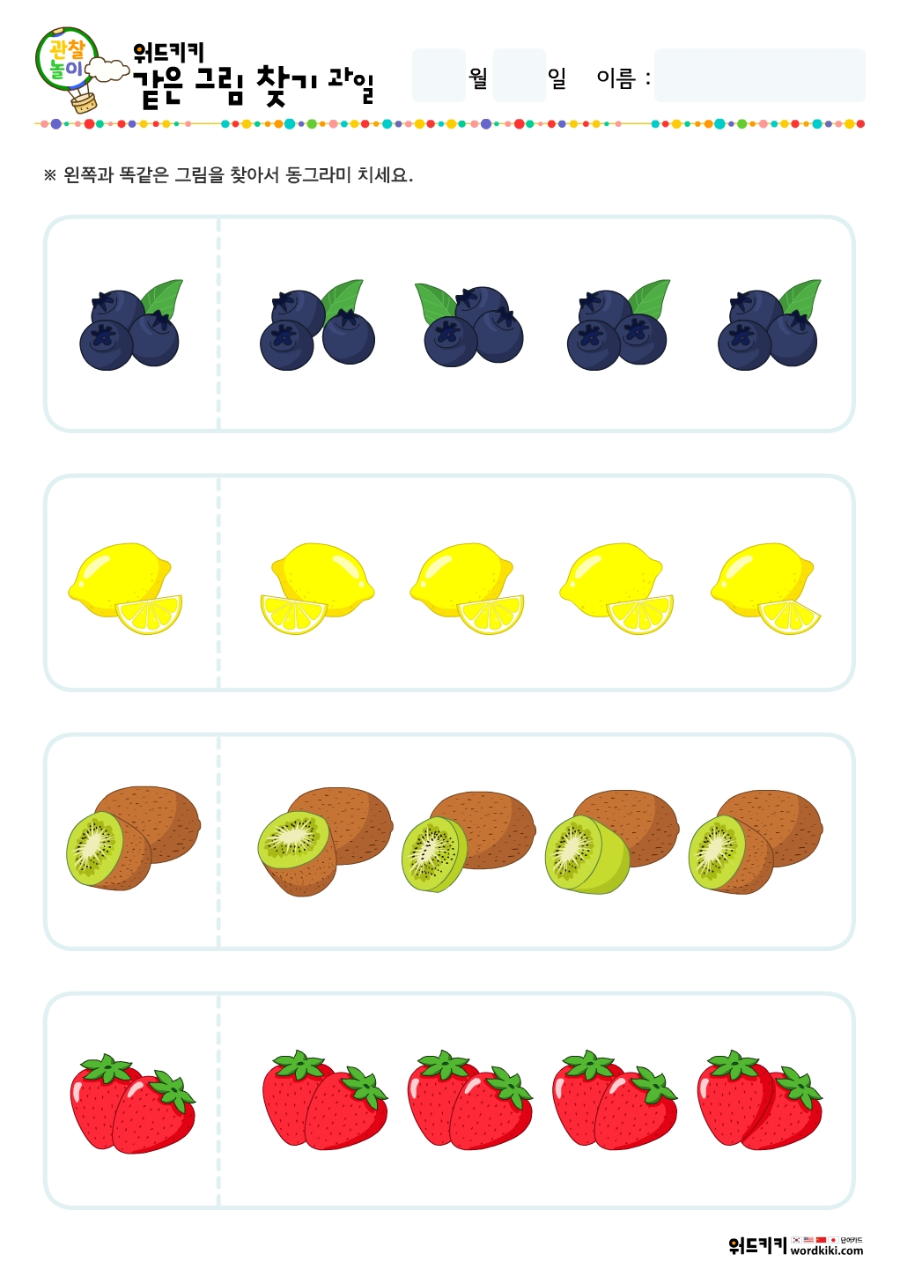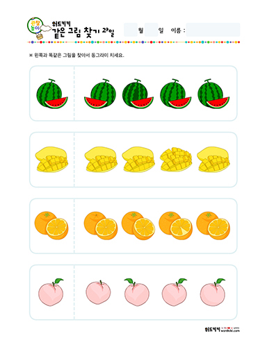같은 그림 찾기 과일 테마 활동지로