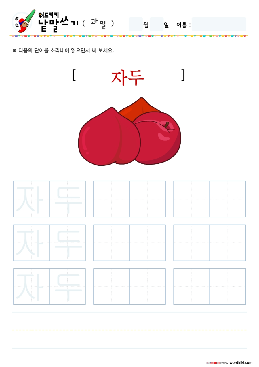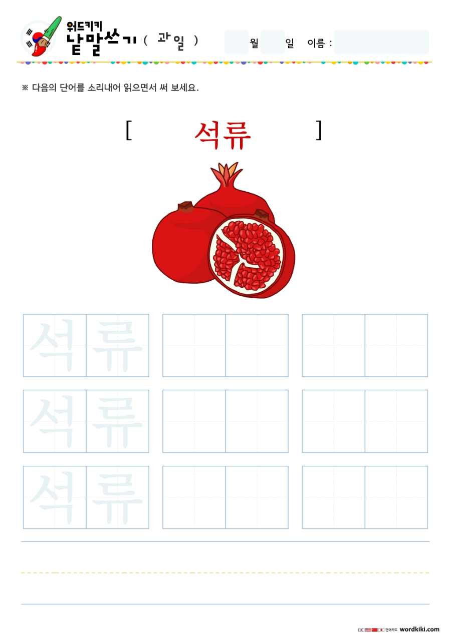 | [한글단어쓰기 12장] 06-1 한국어 과일 단어쓰기 (큰글자1) korean Writing - Fruit (0) | 2024.05.27 |