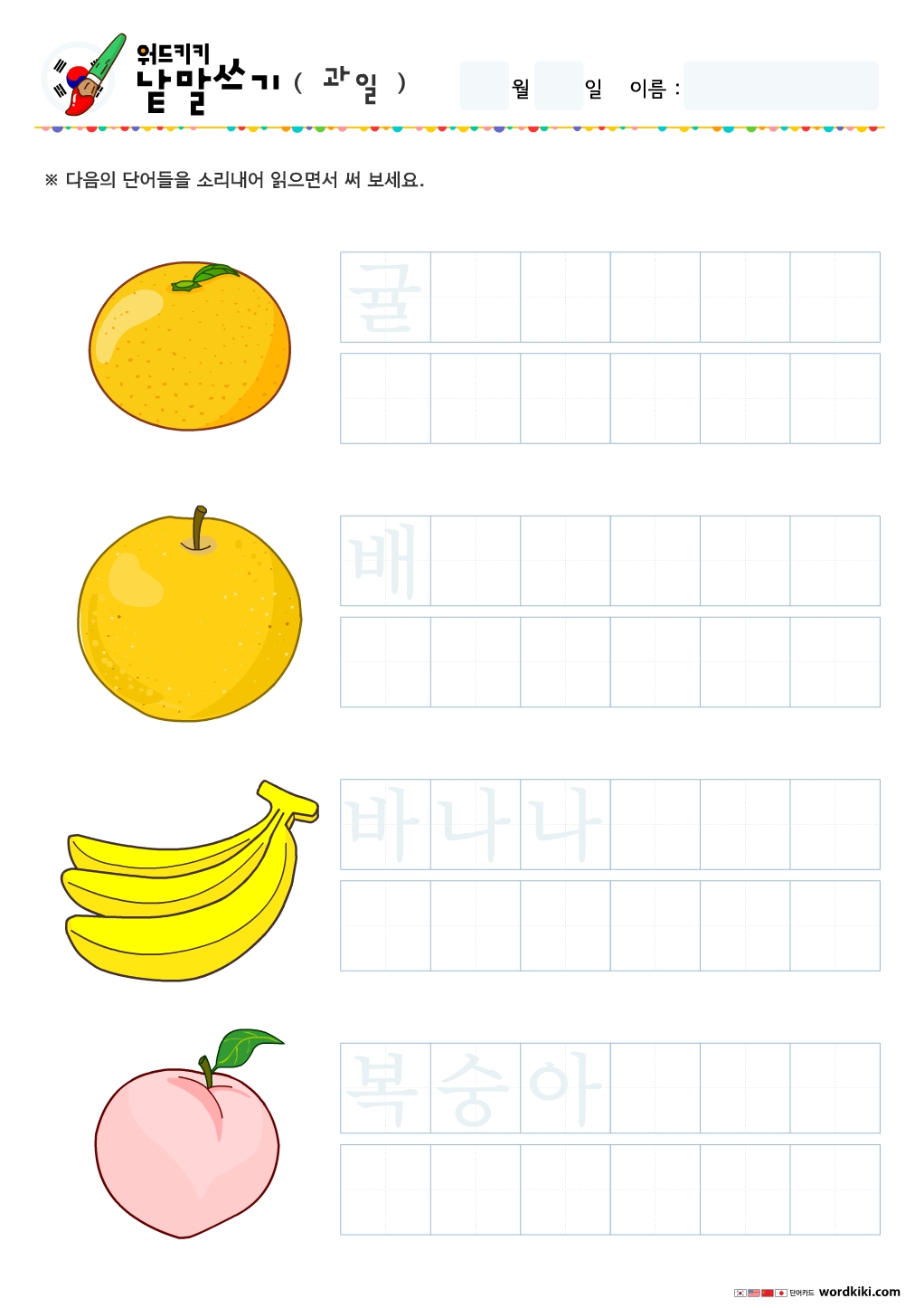 | [한글단어쓰기 12장] 06-1 한국어 과일 단어쓰기 (큰글자2) korean Writing - Fruit (0) | 2024.05.28 |