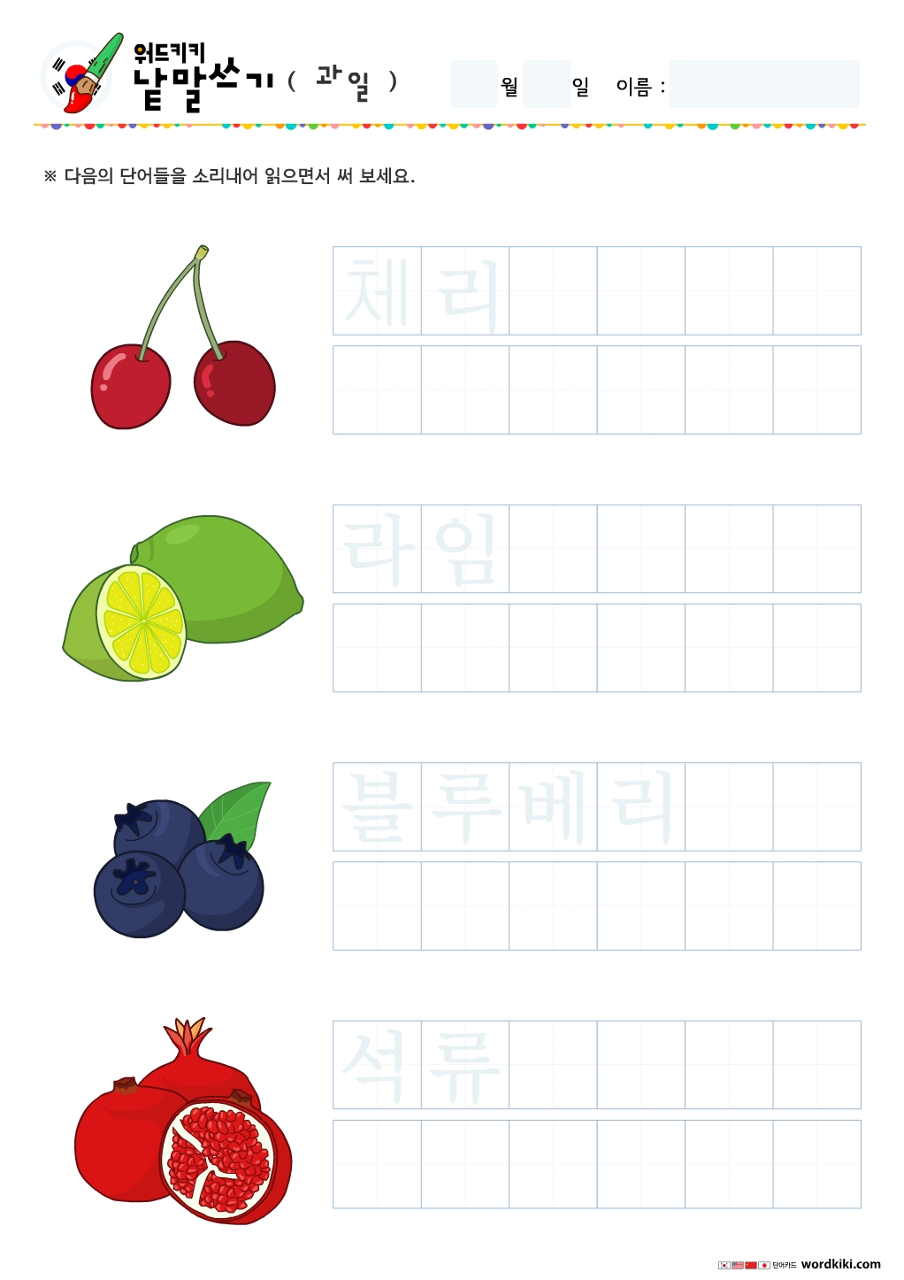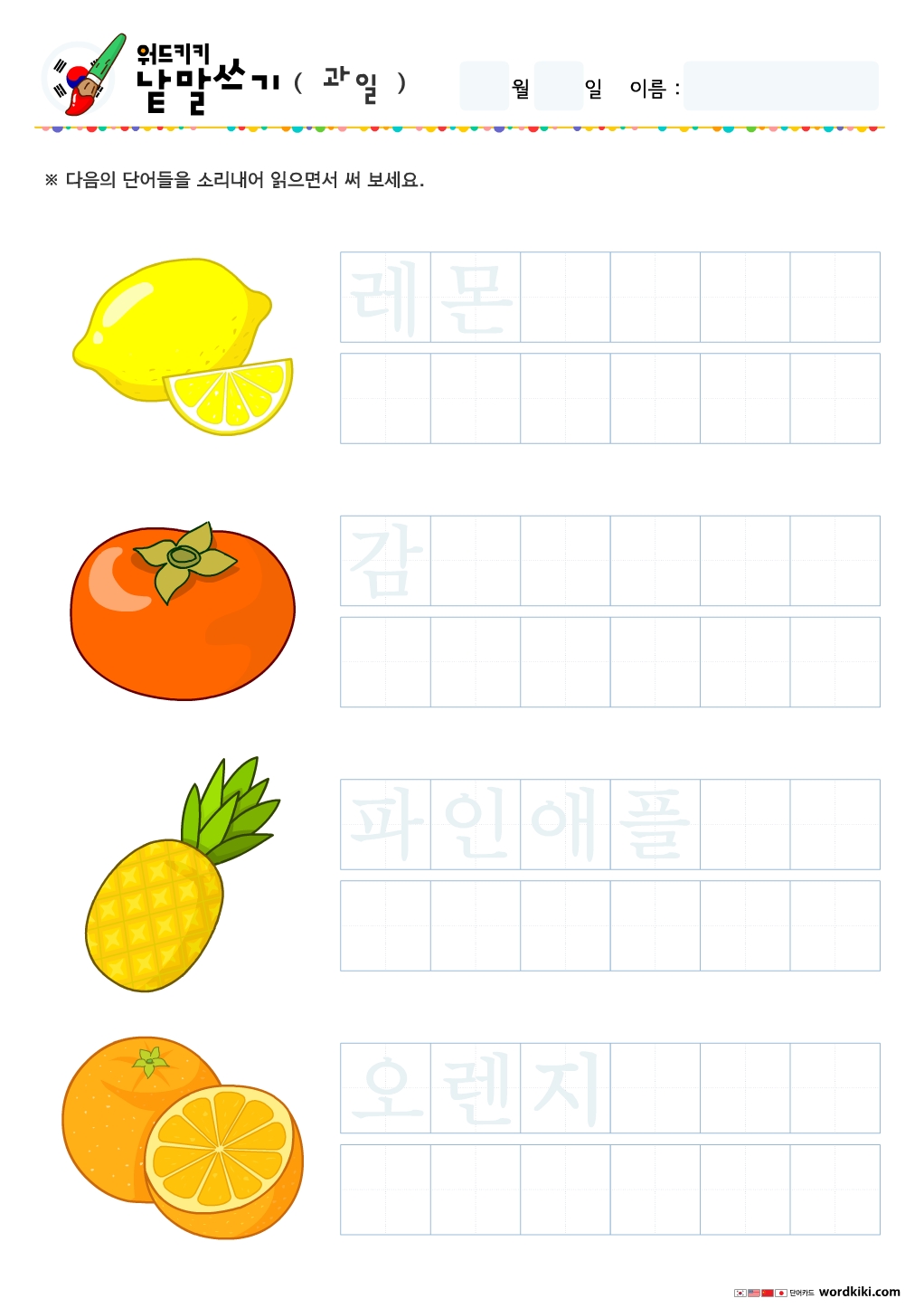 | [한글단어쓰기 12장] 06-1 한국어 과일 단어쓰기 (큰글자2) korean Writing - Fruit (0) | 2024.05.28 |